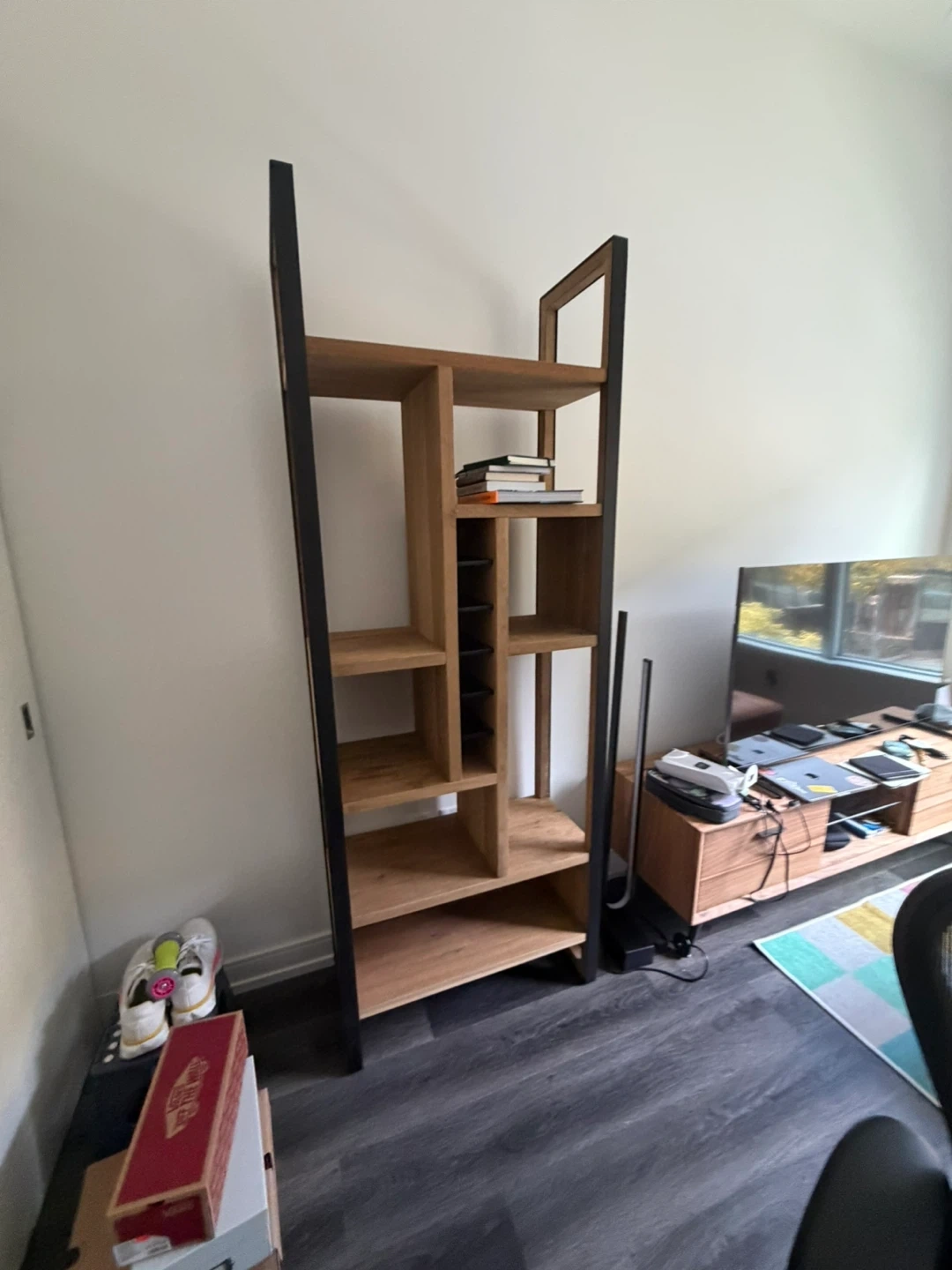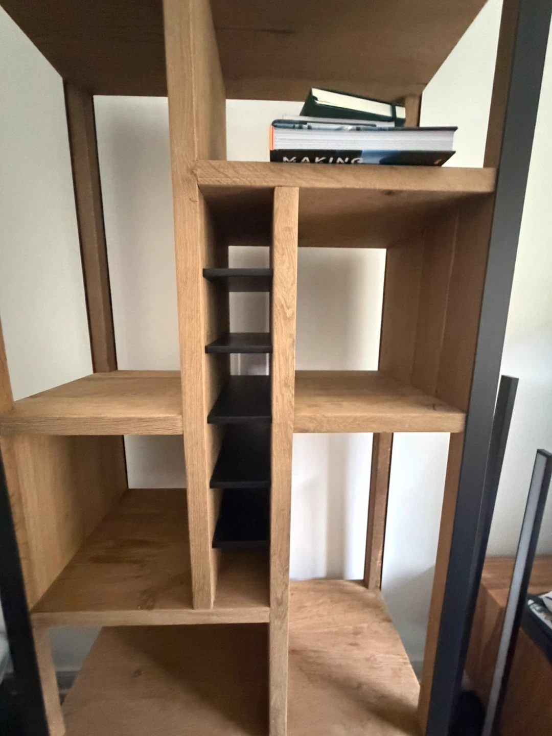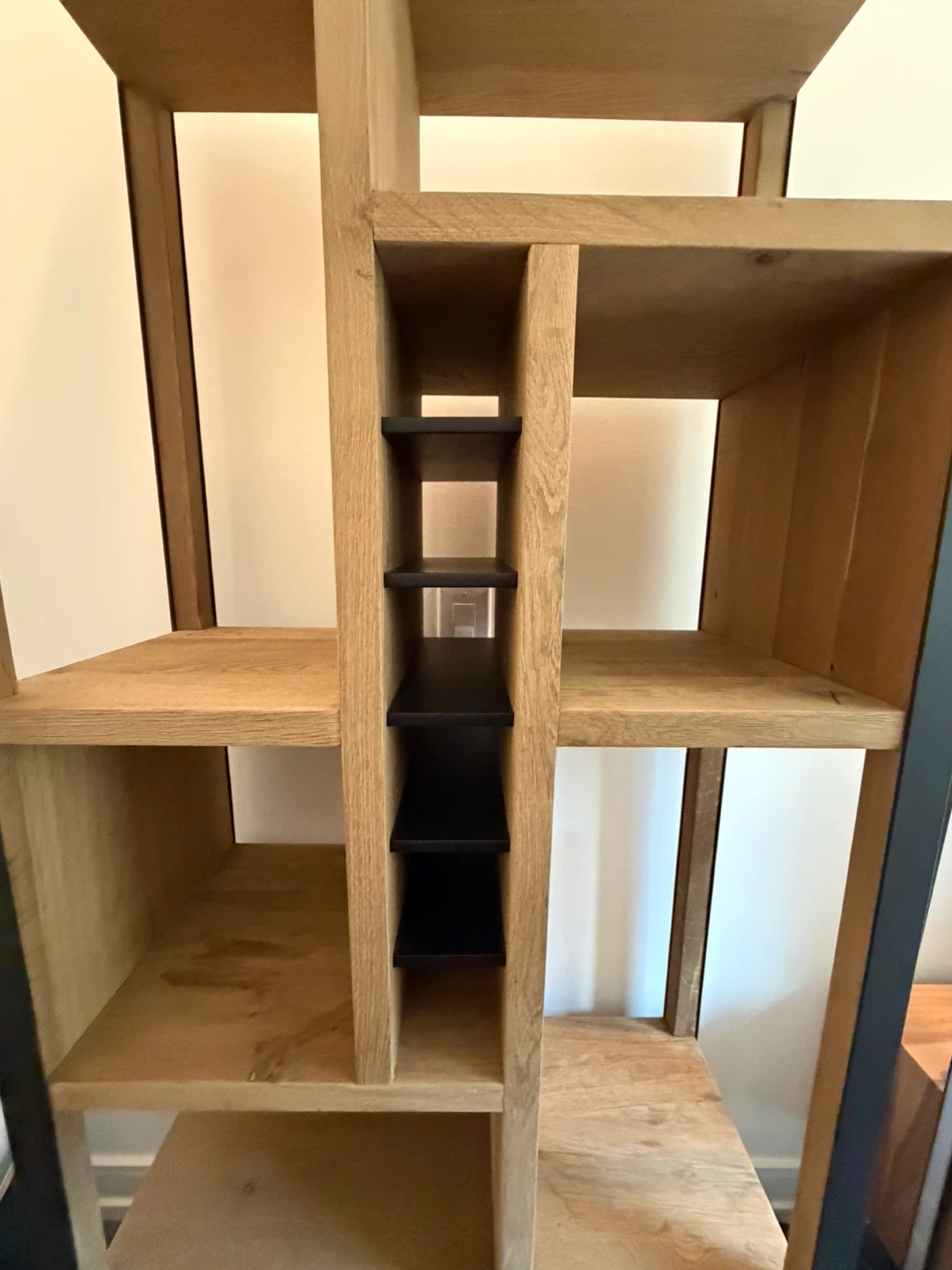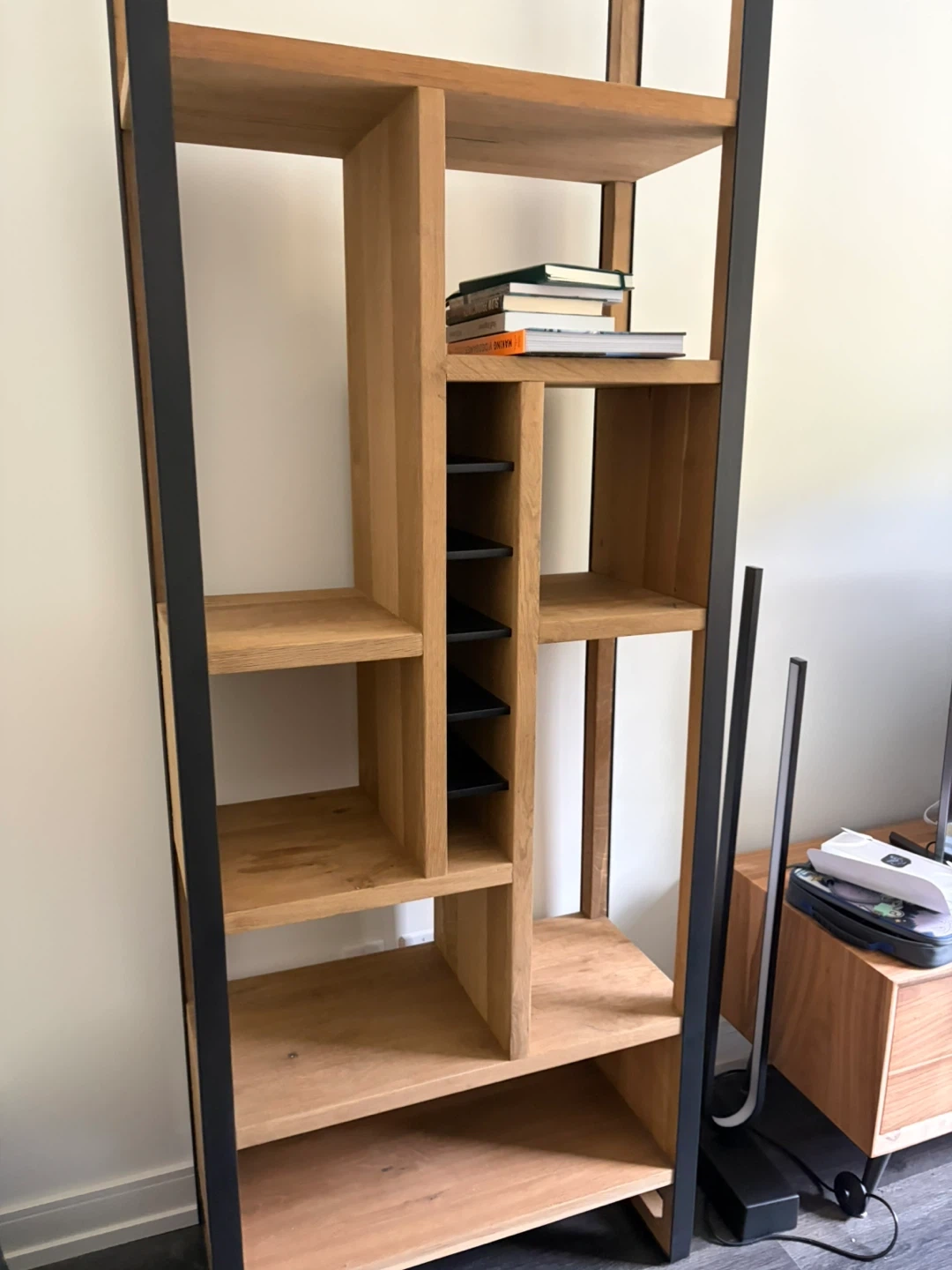 Natural wood bookcase with metal framing room for wine bottles in the middle