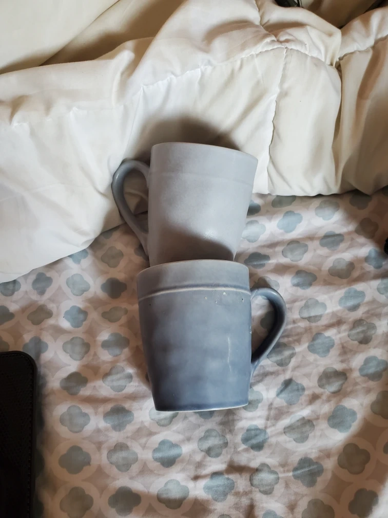 Selling a set of two stoneware mugs in varying shades of blue. They are in good condition and perfect for your morning coffee or tea! They have a nice, sturdy feel to them