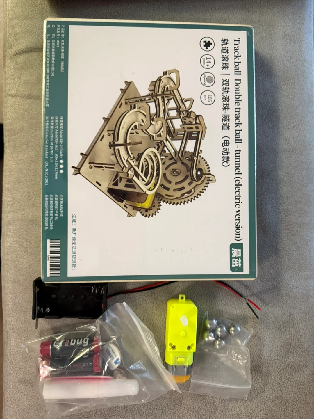 It comes with all the components shown in the picture, including the motor, batteries, and steel balls. The box is also included