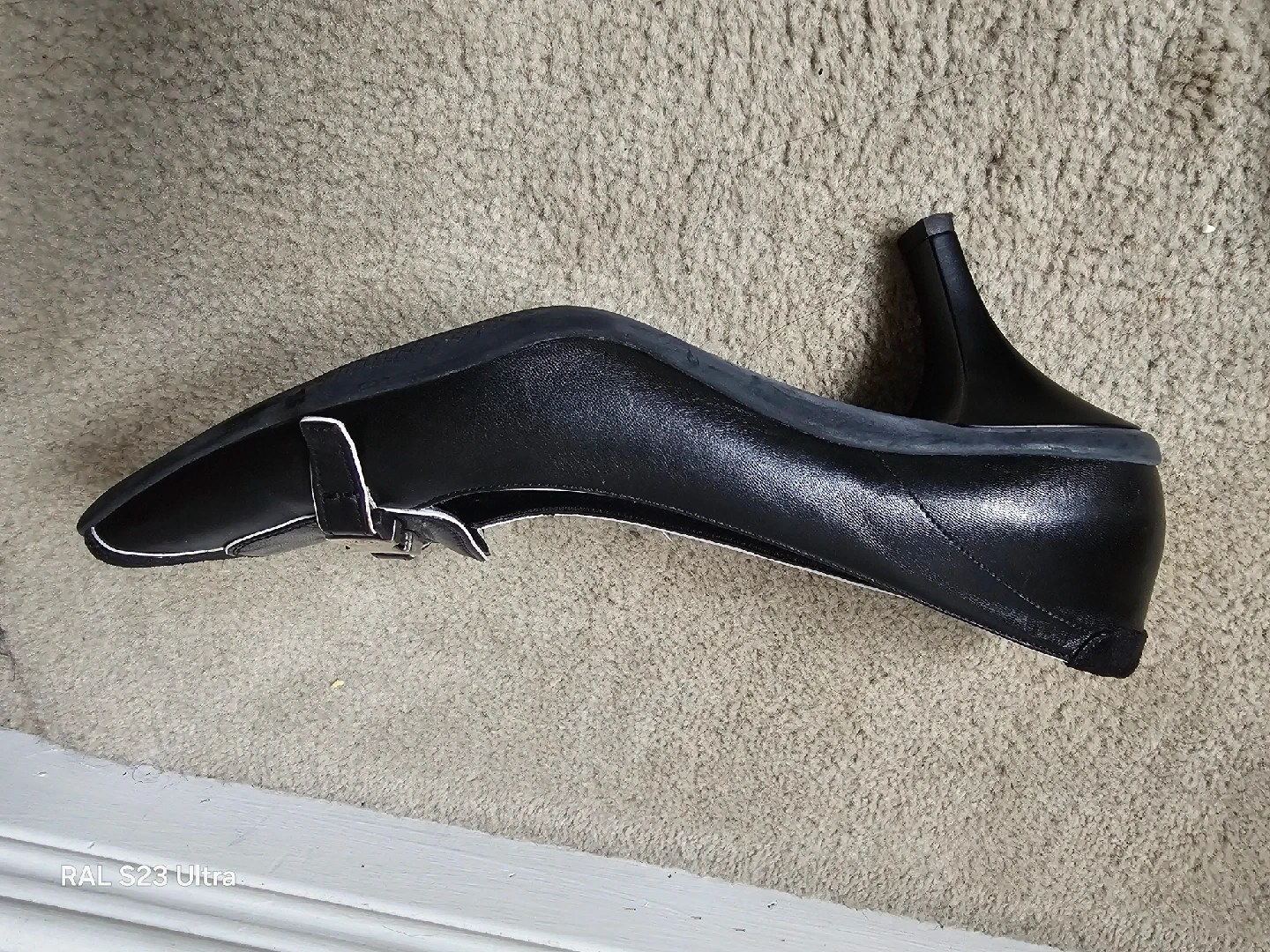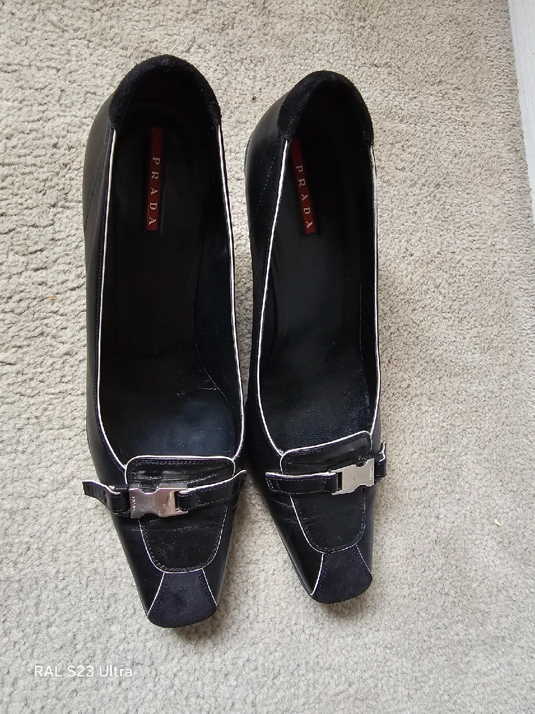 These are a pair of Prada heels in black leather. They feature a unique buckle detail and a stylish, low heel. Perfect for adding a touch of elegance to any outfit!