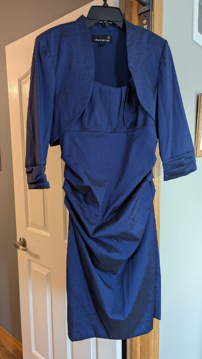 60Here's a lovely Laura dress with a matching bolero in a beautiful navy blue colour. Size 10p. guys more like a size 8. It's in great condition and perfect for a special occasion! The dress has a flattering design with ruching details.