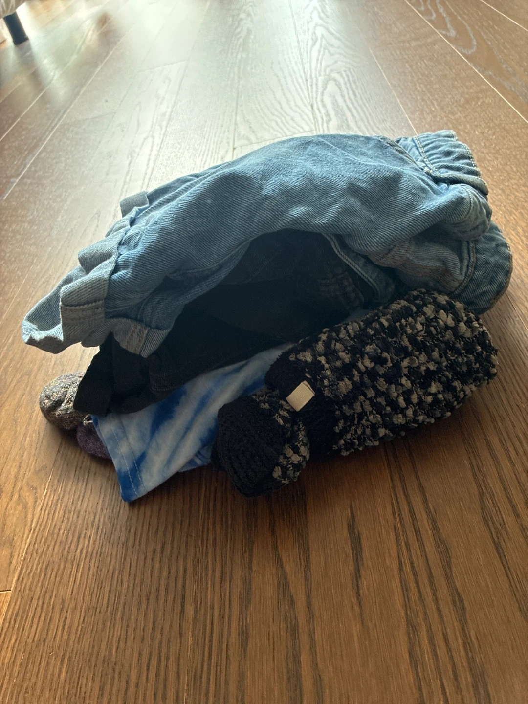 I have a mixed lot of clothing for sale. There's a 2 pairs of jeans, a t-shirt, and some socks. All in good condition and ready for a new home!