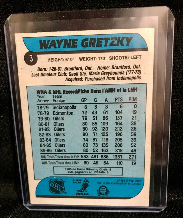 Here is a 1986 O-Pee-Chee Wayne Gretzky hockey card, a must-have for any serious collector, showcasing 'The Great One' in his prime. This card is a classic piece of sports memorabilia! Perfect for adding a piece of hockey history to your collection. If the ad is up, it's still available and ready to go to a new home!