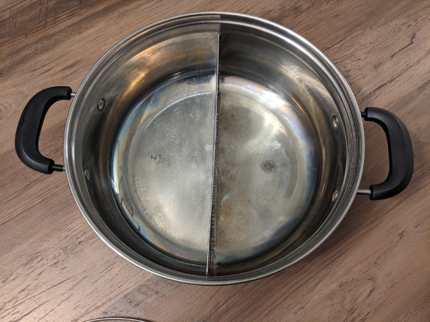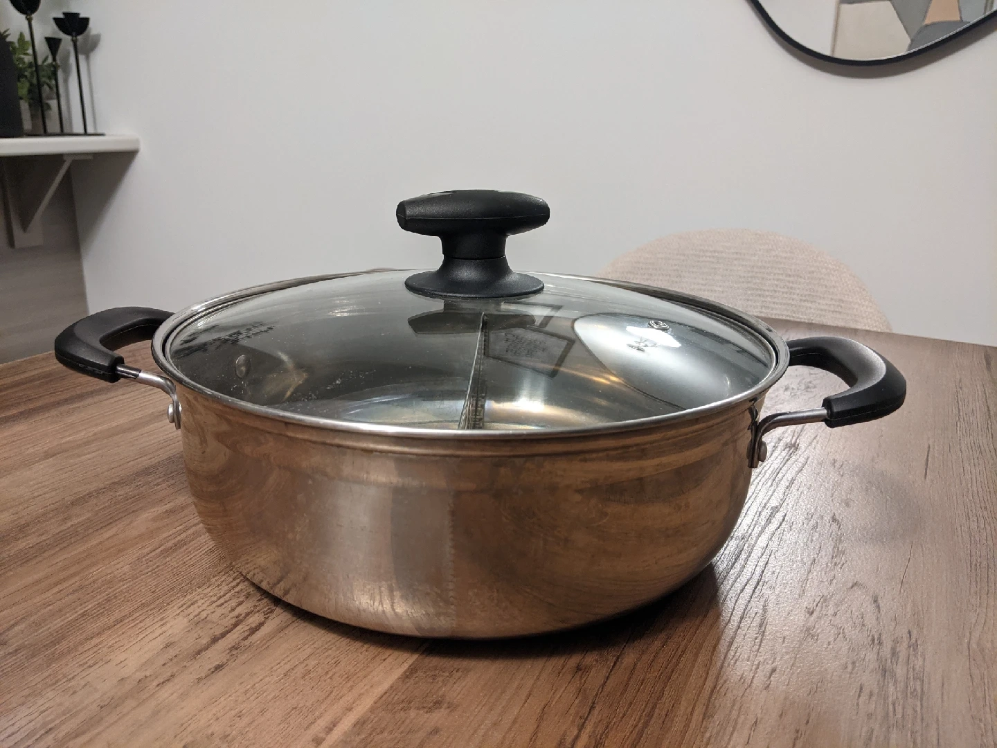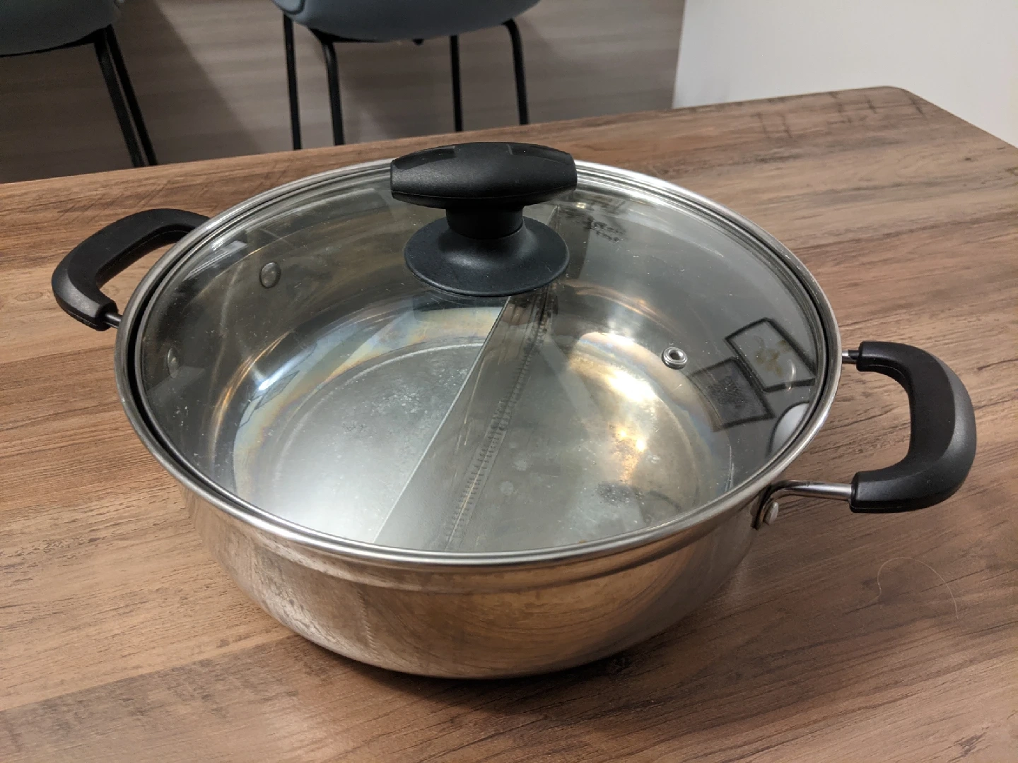 Enjoy delicious meals with this used stainless steel hot pot featuring a split design, allowing you to cook two different broths at once. This pot comes with a glass lid and side handles for easy handling. A versatile addition to any kitchen, especially for those who love to entertain or enjoy diverse flavors.