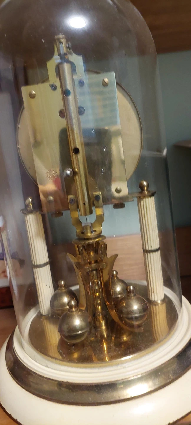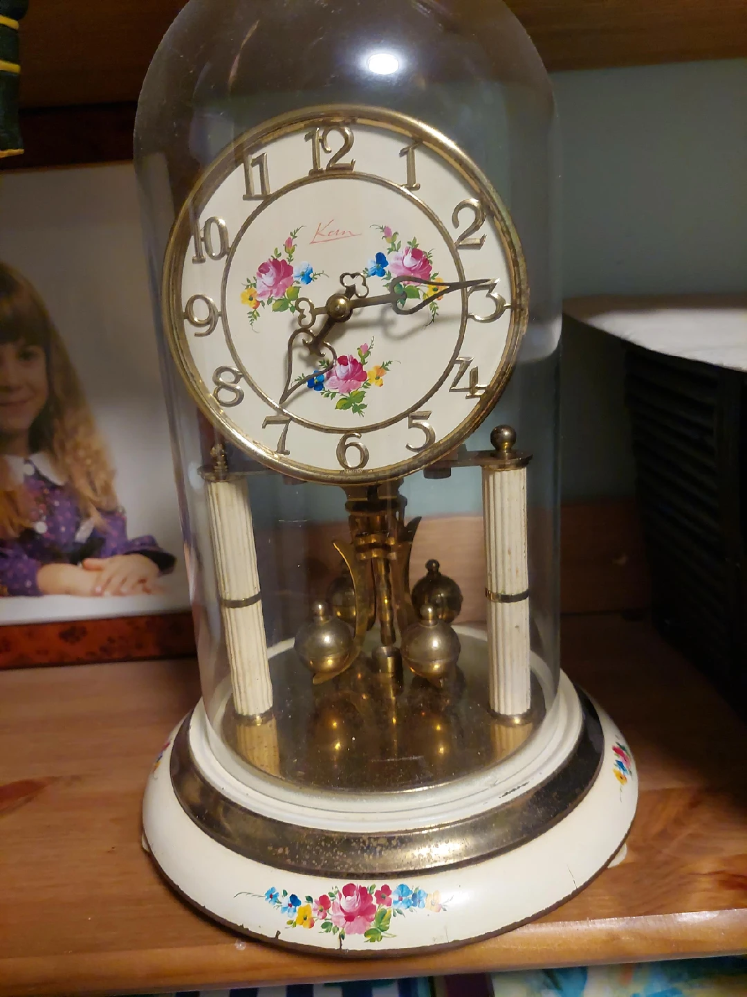 Selling a lovely Kern anniversary clock, complete with its glass dome. It features a floral design on the clock face and a classic pendulum movement. Perfect for adding a touch of vintage charm to any room!