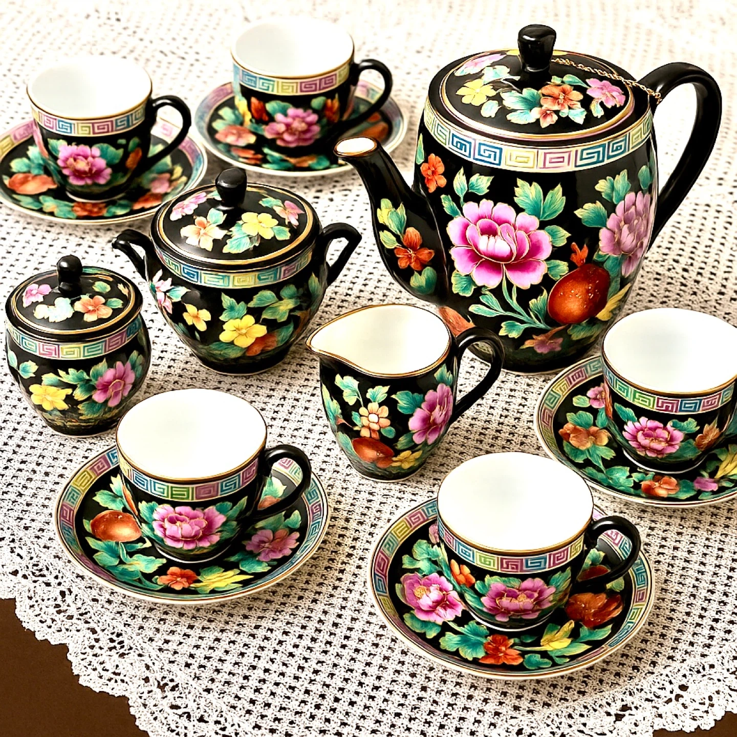 All porcelain hand painted Chinese export 60’s vintage coffee tea set . For 6 , with pot , sugar bowl and milk jar all complete set I like brand new condition . Price $200 obo