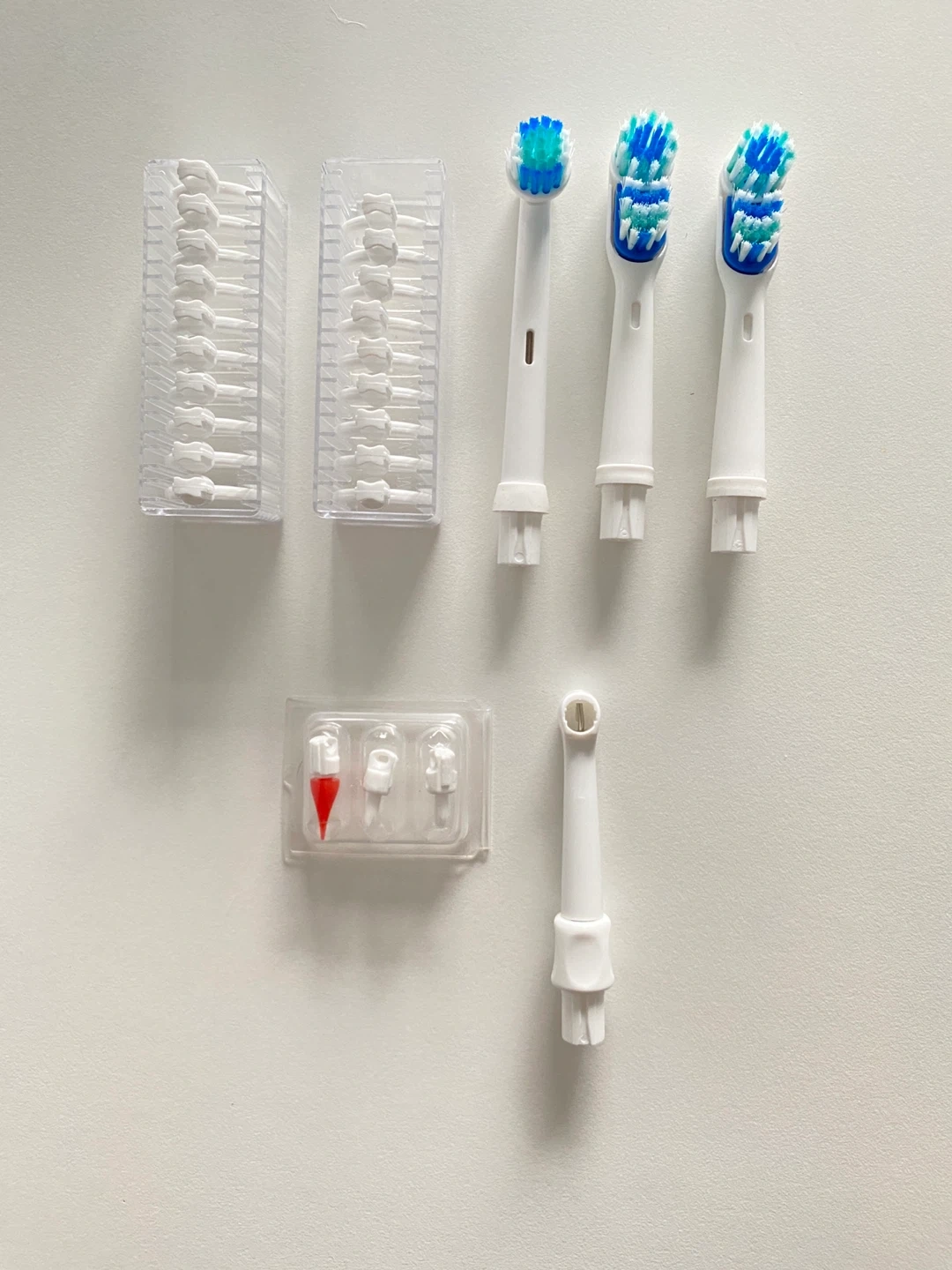 Selling a set of various replacement brush heads and interdental brush heads for electric toothbrush. Also has gum massager and floss attachments.