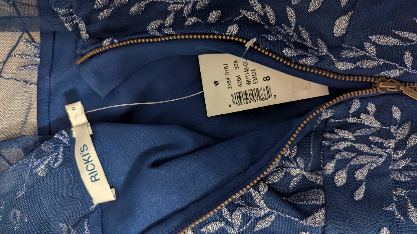 60Selling a New beautiful blue dress from Ricki's in size 8! It features a lovely floral pattern and a flattering silhouette. Perfect for a special occasion or a night out.
