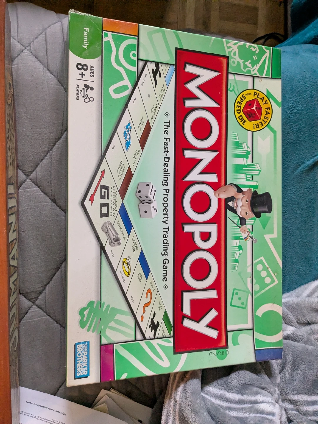10asking $10 Get ready for some fast-dealing property trading with this Monopoly board game! It's the Family Edition, perfect for ages 8+ and 2-8 players. The box includes everything you need to play, with classic Monopoly features like Chance cards and iconic properties.