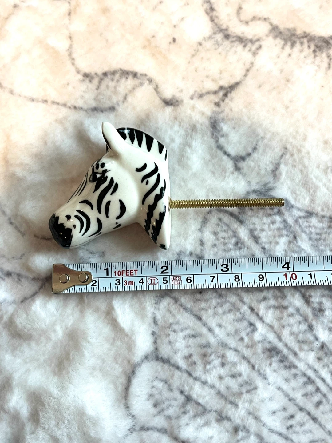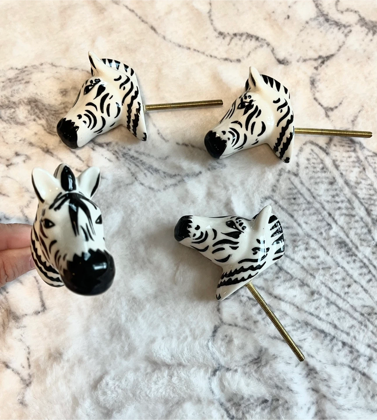 389Fun and stylish 3D zebra head knobs from Zara Home – perfect for dresser drawers, cabinets, or kids’ furniture. Set of 4. Ceramic. Approx. 2.5” long (see photo for scale). Screws can be trimmed to fit. Asking $20 for the full set (originally $60+)