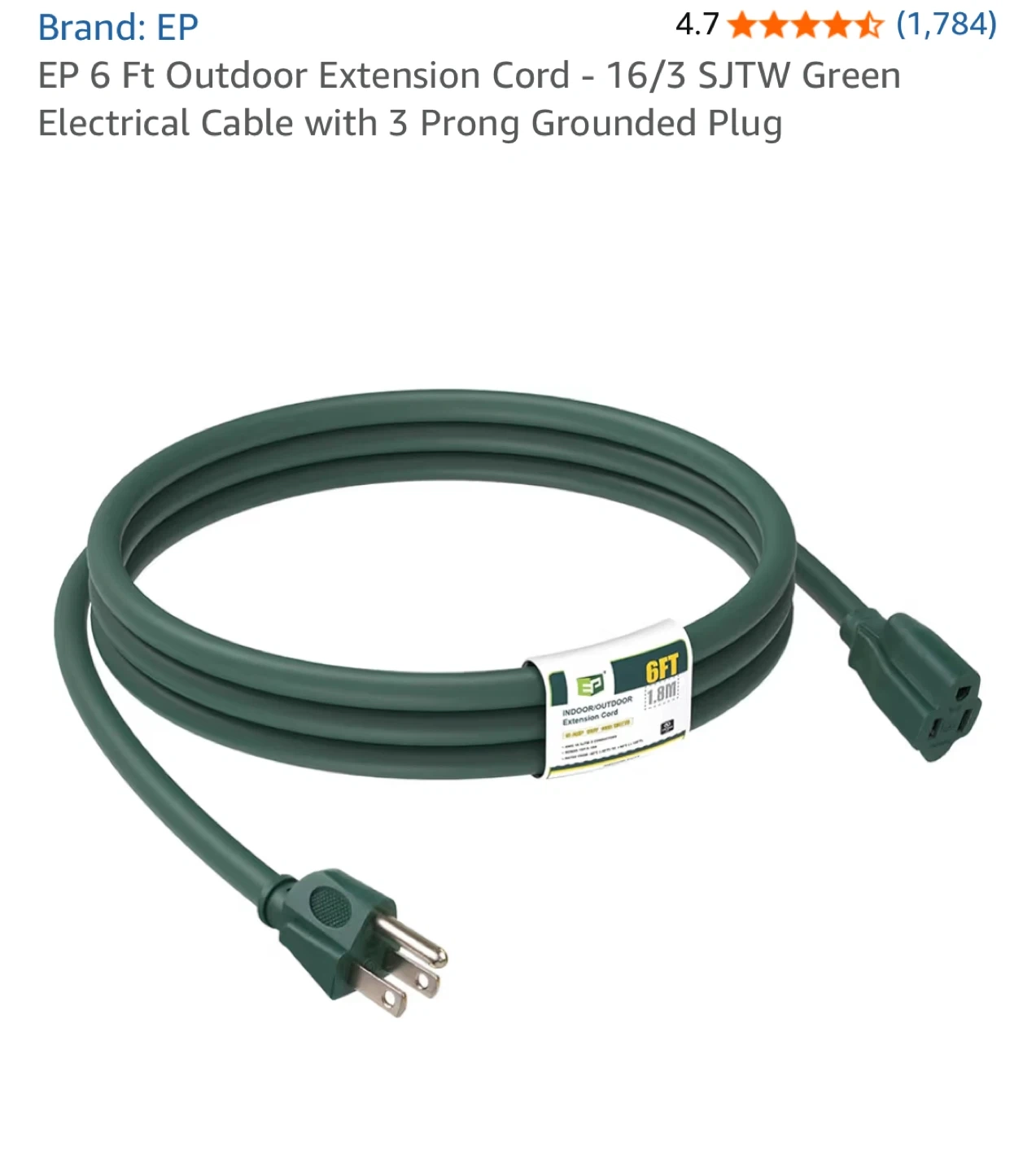 Selling an EP 6 ft outdoor extension cord in green. It's a 16/3 SJTW electrical cable with a 3-prong grounded plug, perfect for outdoor use