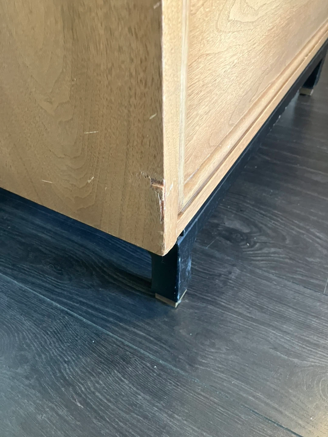 There is cosmetic damage (see photo) that does not affect the structure or the drawers. The dark base could use a new coat of paint.
