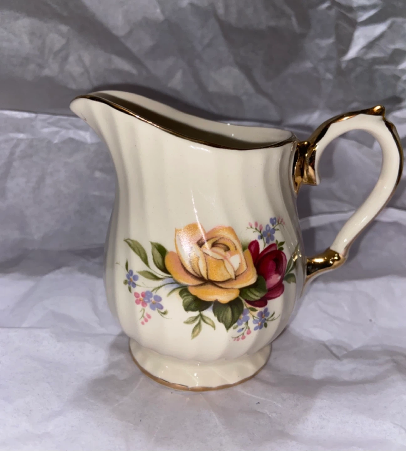 Cream background with multi-colored roses (red, pink, yellow) and small blue forget-me-nots.