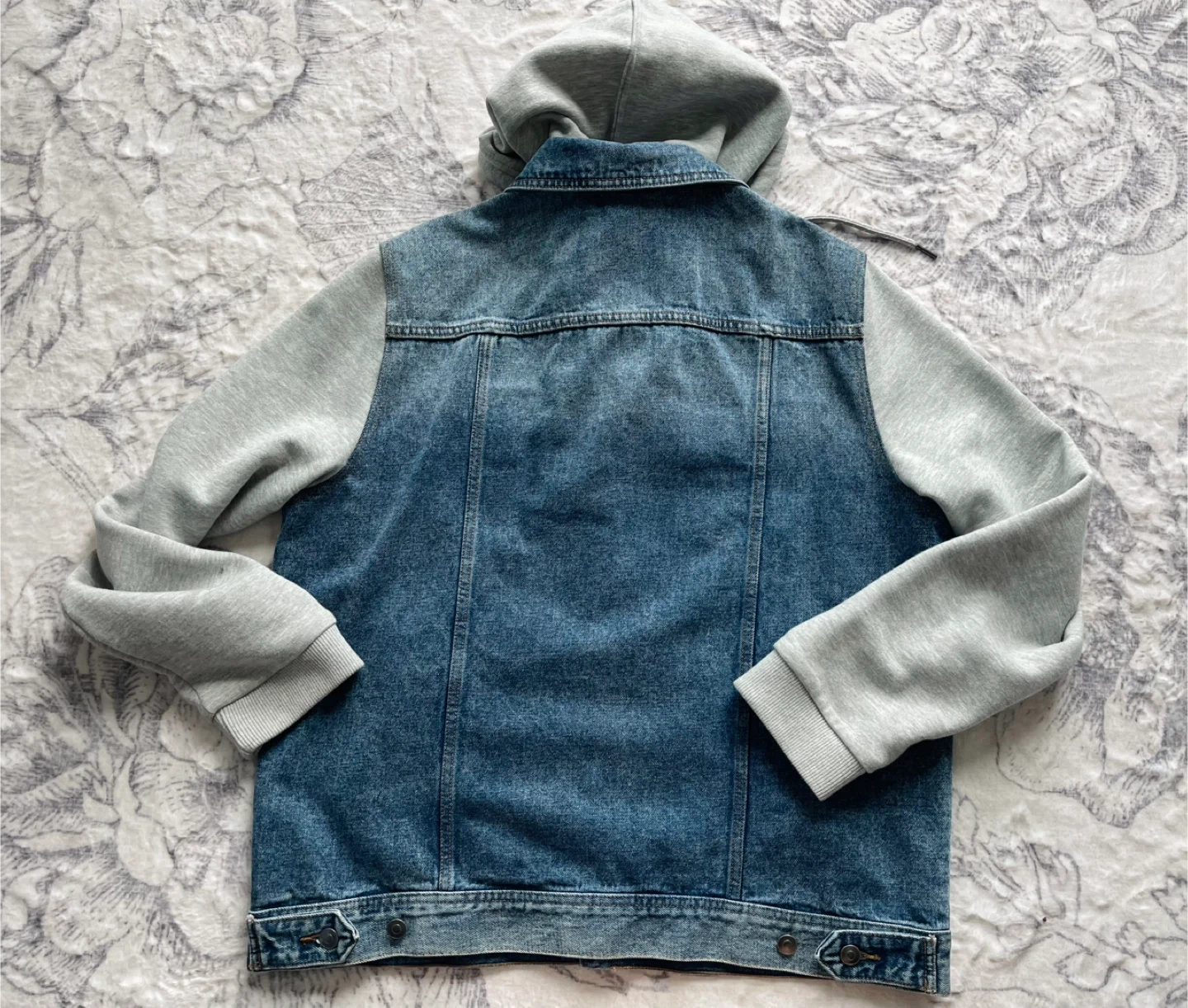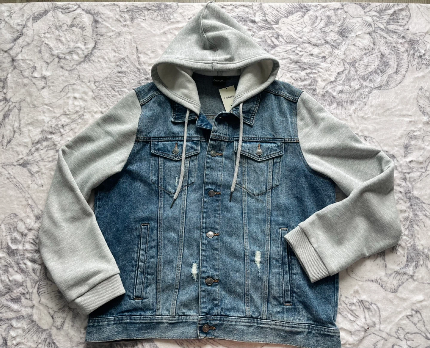 New George Men’s Denim Jacket with Grey Hoodie Sleeves – Size L