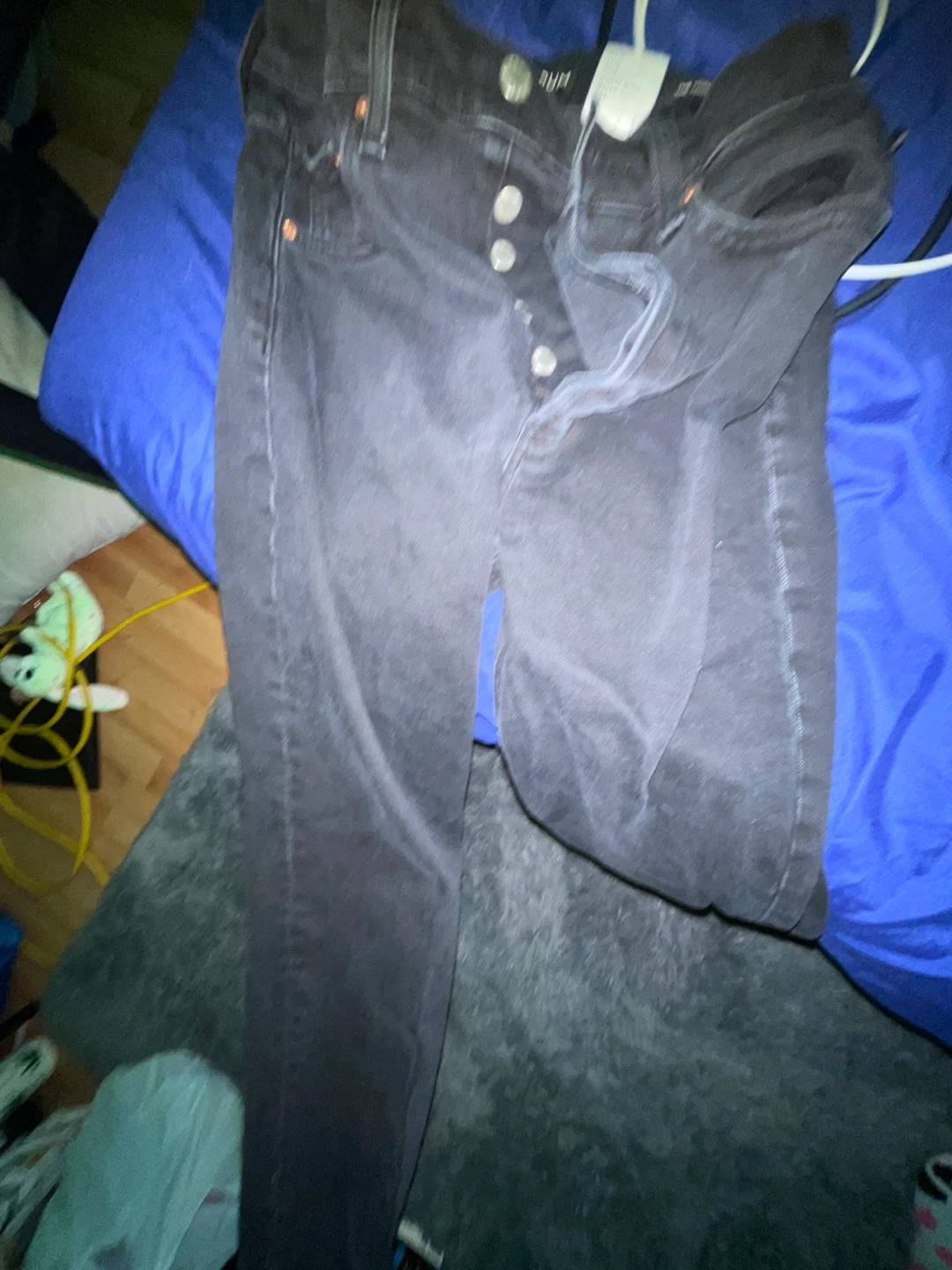These are black Aritzia Forum jeans. They're made of denim with a button-fly closure. The waist size is 26.