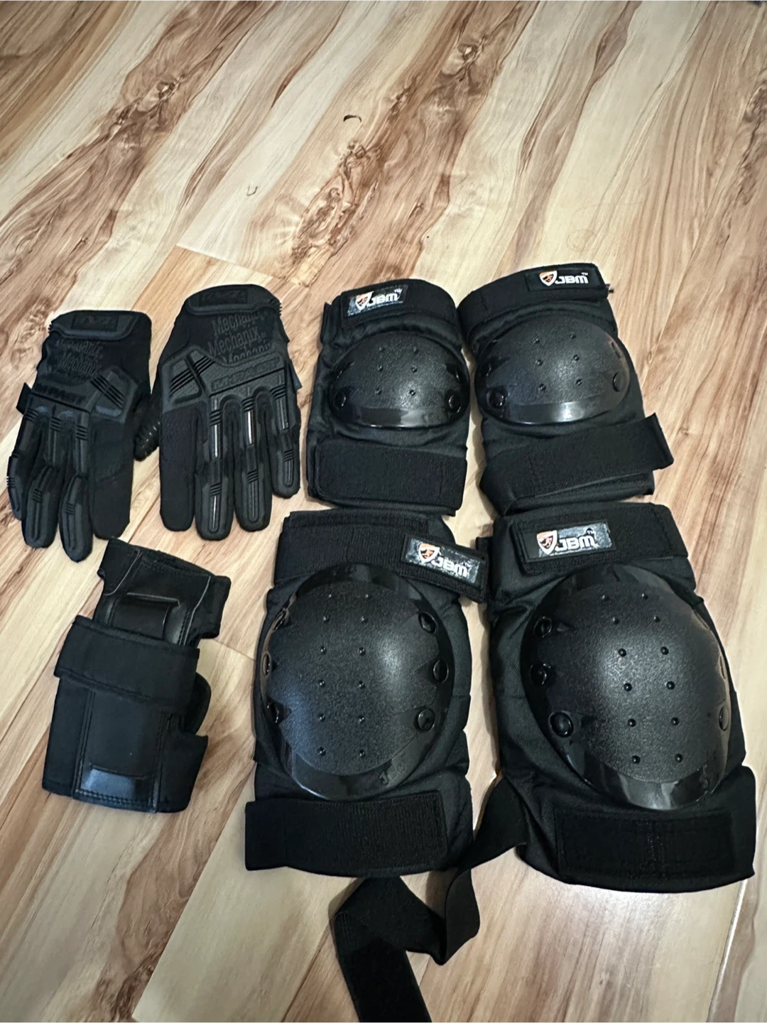 Selling a JBM protective gear set, which includes knee pads, elbow pads, and gloves. The gloves are Mechanix brand. All items are size L. Comes with a carrying bag!