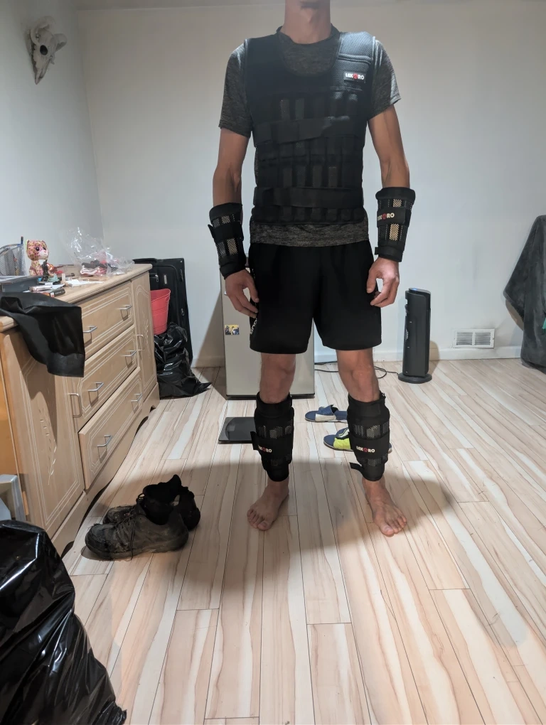 LEKRO weighted vest along with wrist and leg weights. This set is perfect for adding intensity to your workouts. Great for anyone looking to boost their fitness routine! Total weight 50 lbs (52.9) pr 24 kg.