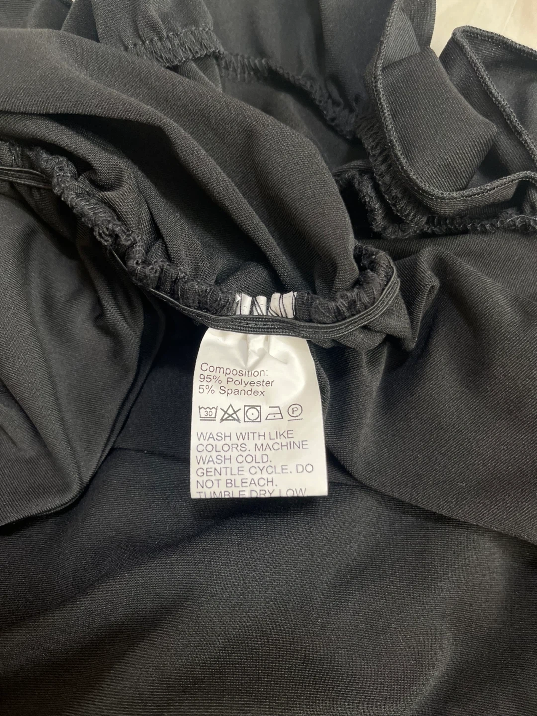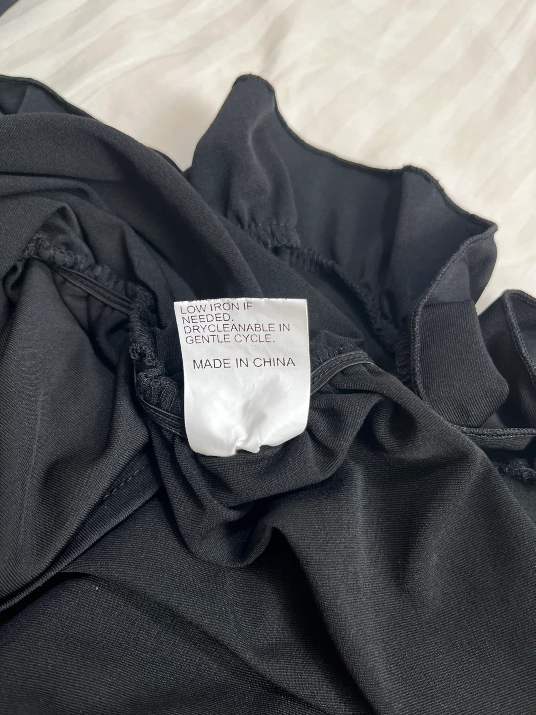 Chic black dress with ruffled bottoms and slight ruching. Features short sleeves and a tie waist. Perfect for versatile styling.