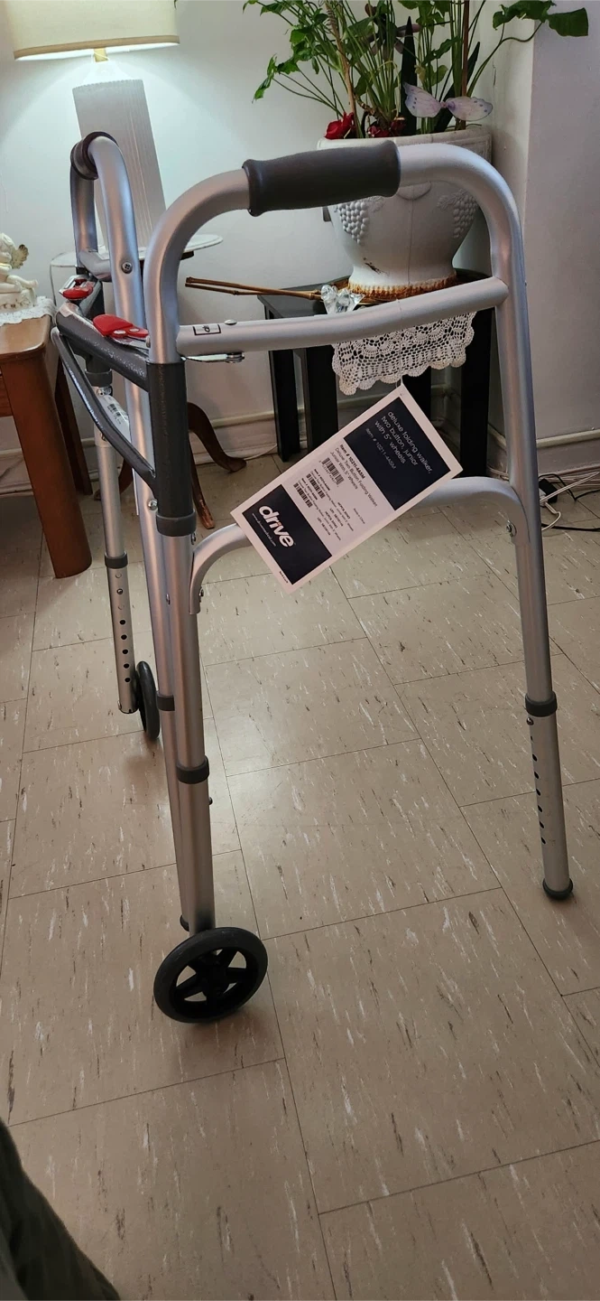 129Selling a Drive Deluxe Folding Walker, Junior size, with two buttons and 5" wheels. It's in great shape and ready to help someone get around safely and comfortably