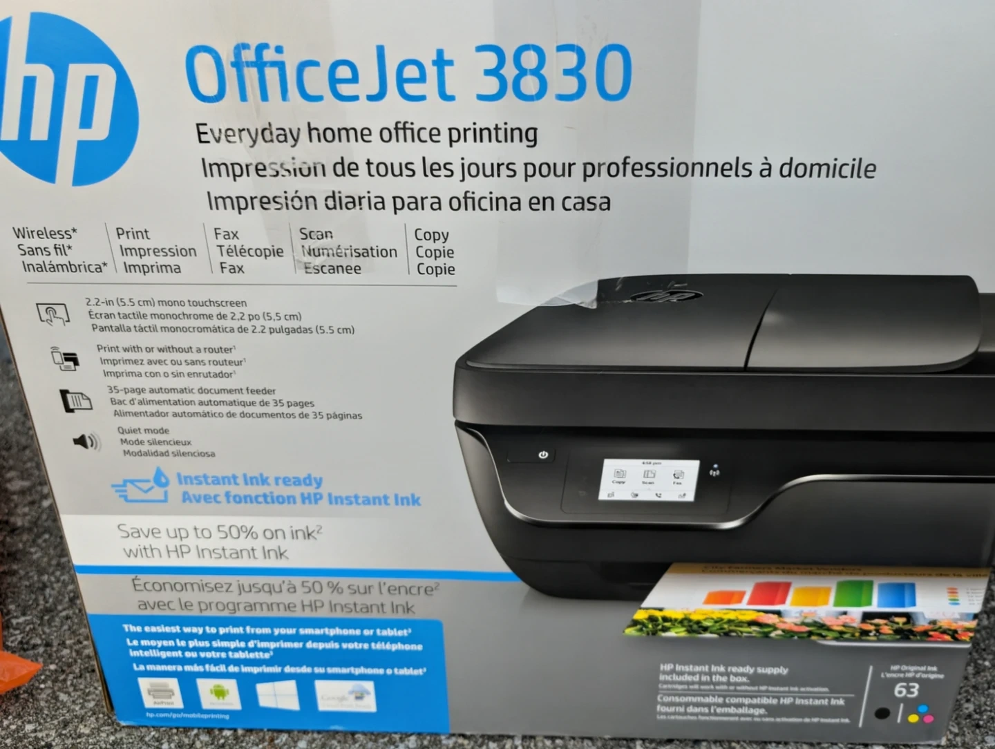 Selling an HP OfficeJet 3830 printer, perfect for everyday home office printing! It features wireless connectivity, print, fax, scan, and copy functions. It also has a 2.2-inch mono touchscreen and a 35-page automatic document feeder. Save up to 50% on ink with HP Instant Ink!