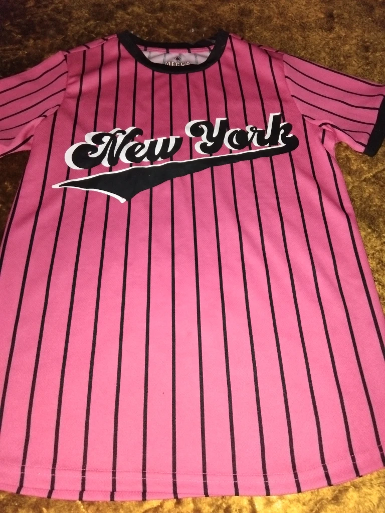 Selling a cute Mecca brand pink t-shirt with black stripes and "New York" written on the front. It's a size small and made of 100% polyester. Perfect for a casual look!
