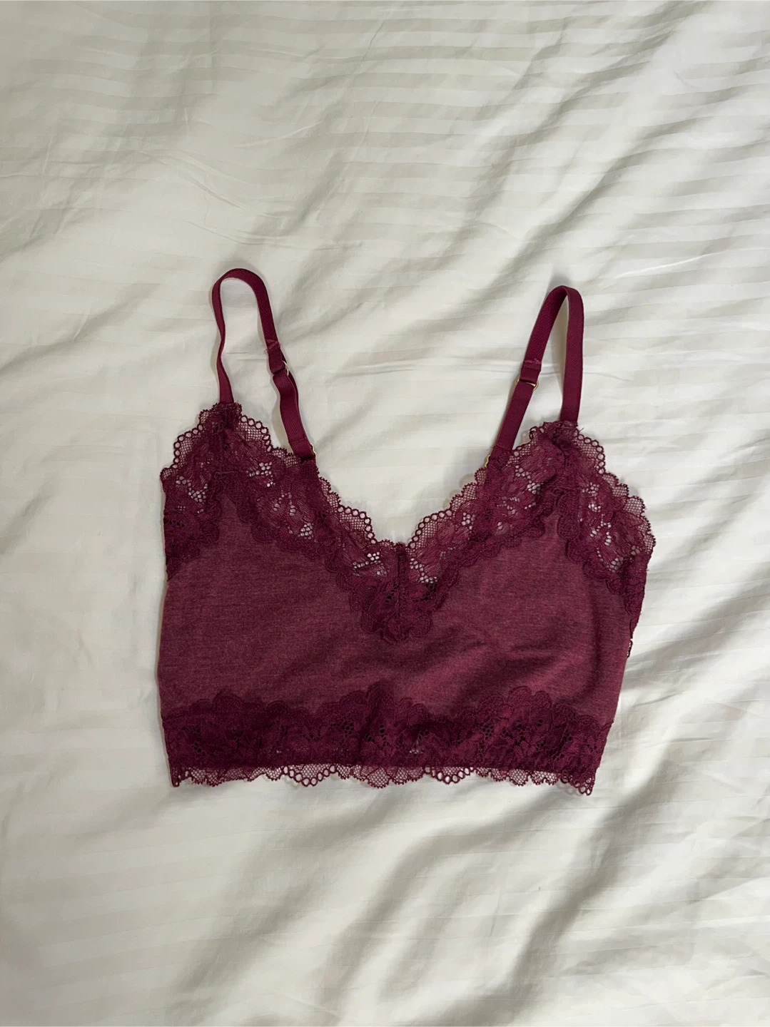 Chic deep red / purple bralette with intricate lace detailing. Offers both comfort and elegance.