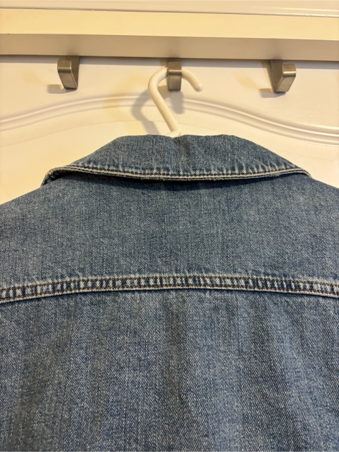 Topshop Moto denim jacket in USA size 10. It's a classic denim jacket with a light wash. There are some distressed details on the sleeves, adding a bit of edge