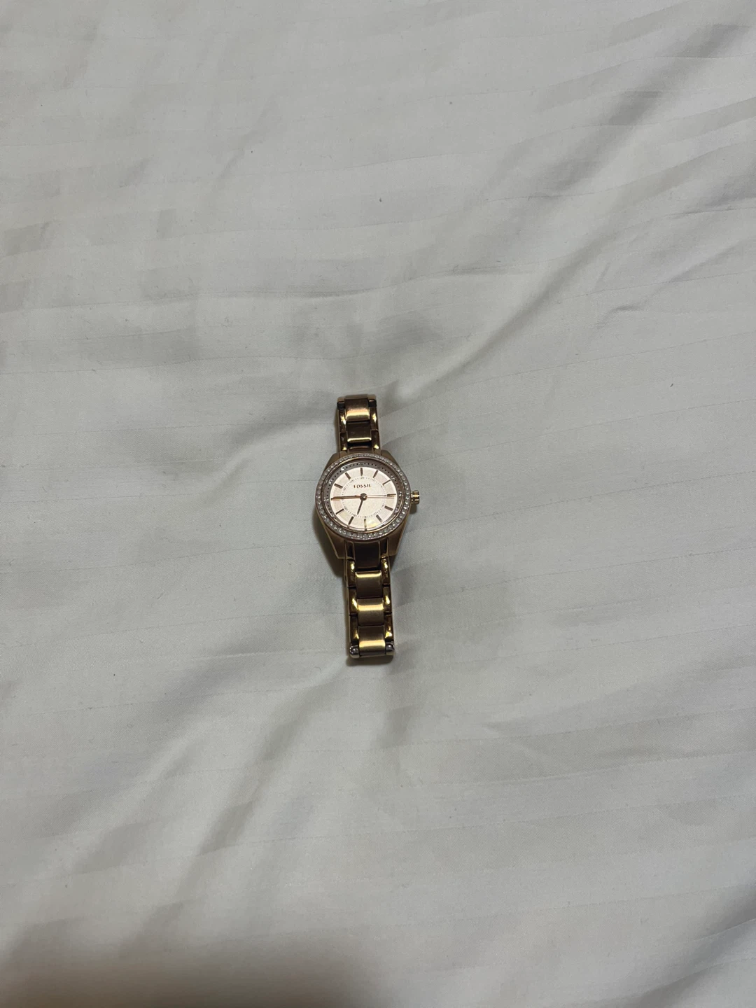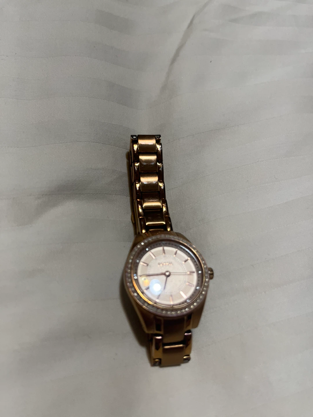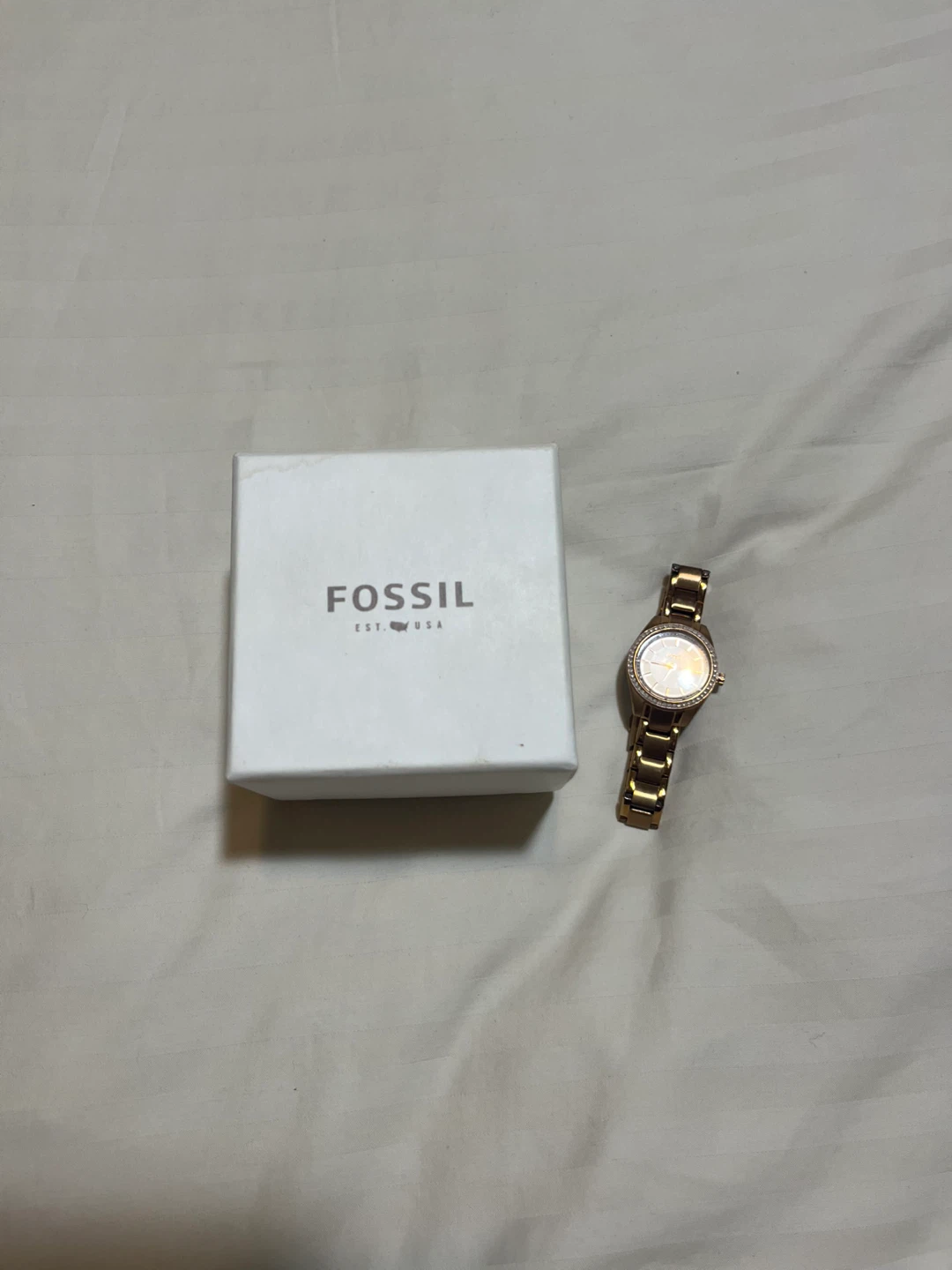 Stylish Fossil watch in gold-tone. Includes branded box.