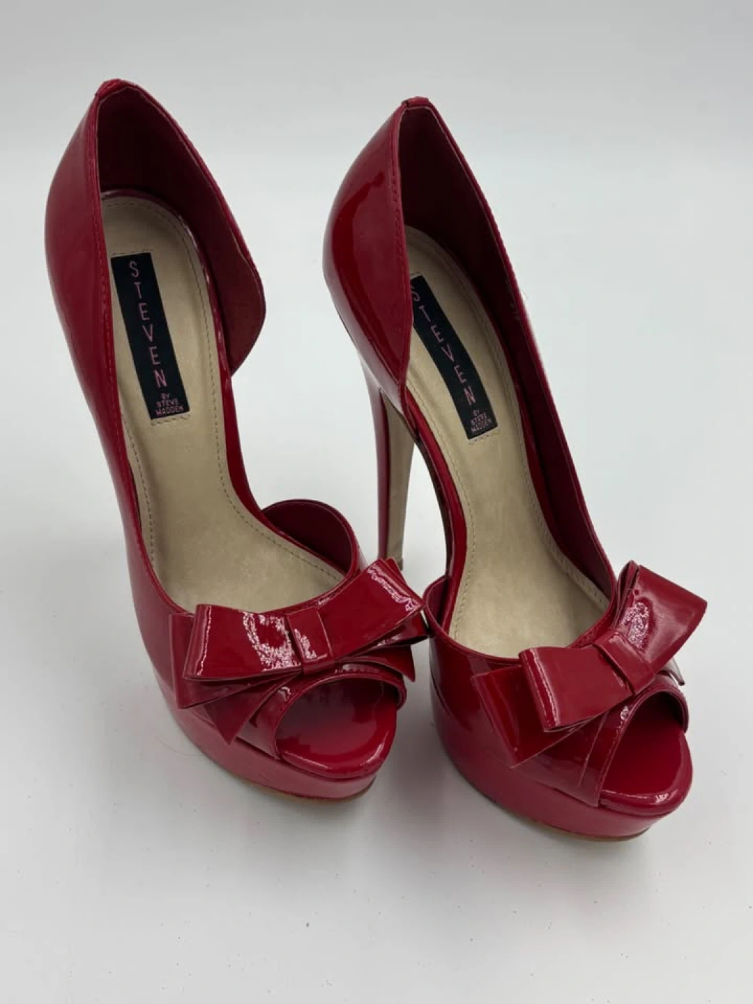 161These are a pair of red patent heels from Steven by Steve Madden. They are a size 9 and feature a cute bow detail on the front. They are in great condition and would be perfect for a night out!