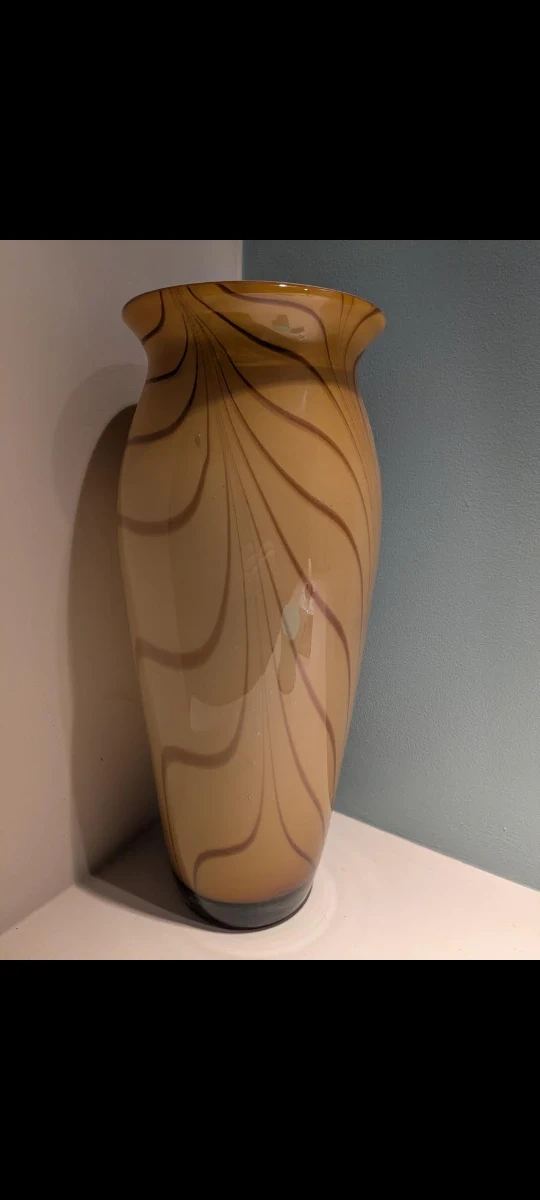 142Here's a lovely brown glass vase with a swirl design. It would look great as a decorative piece in any room of the house!