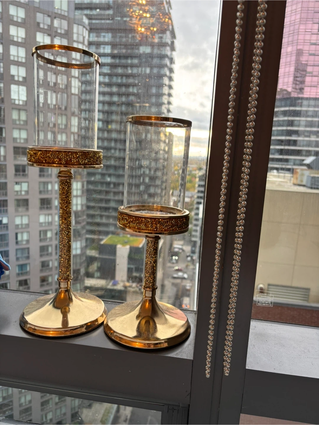 462Selling a set of two decorative candle holders. They're gold in colour and in great condition! Perfect for adding a touch of elegance to any room
