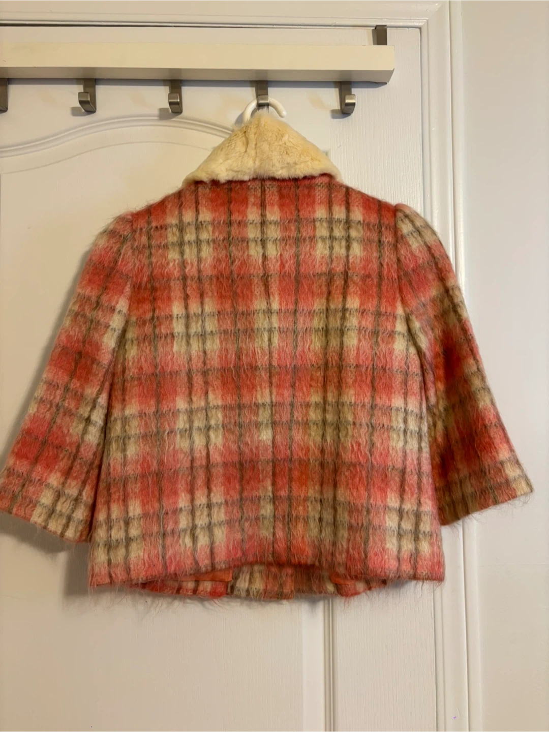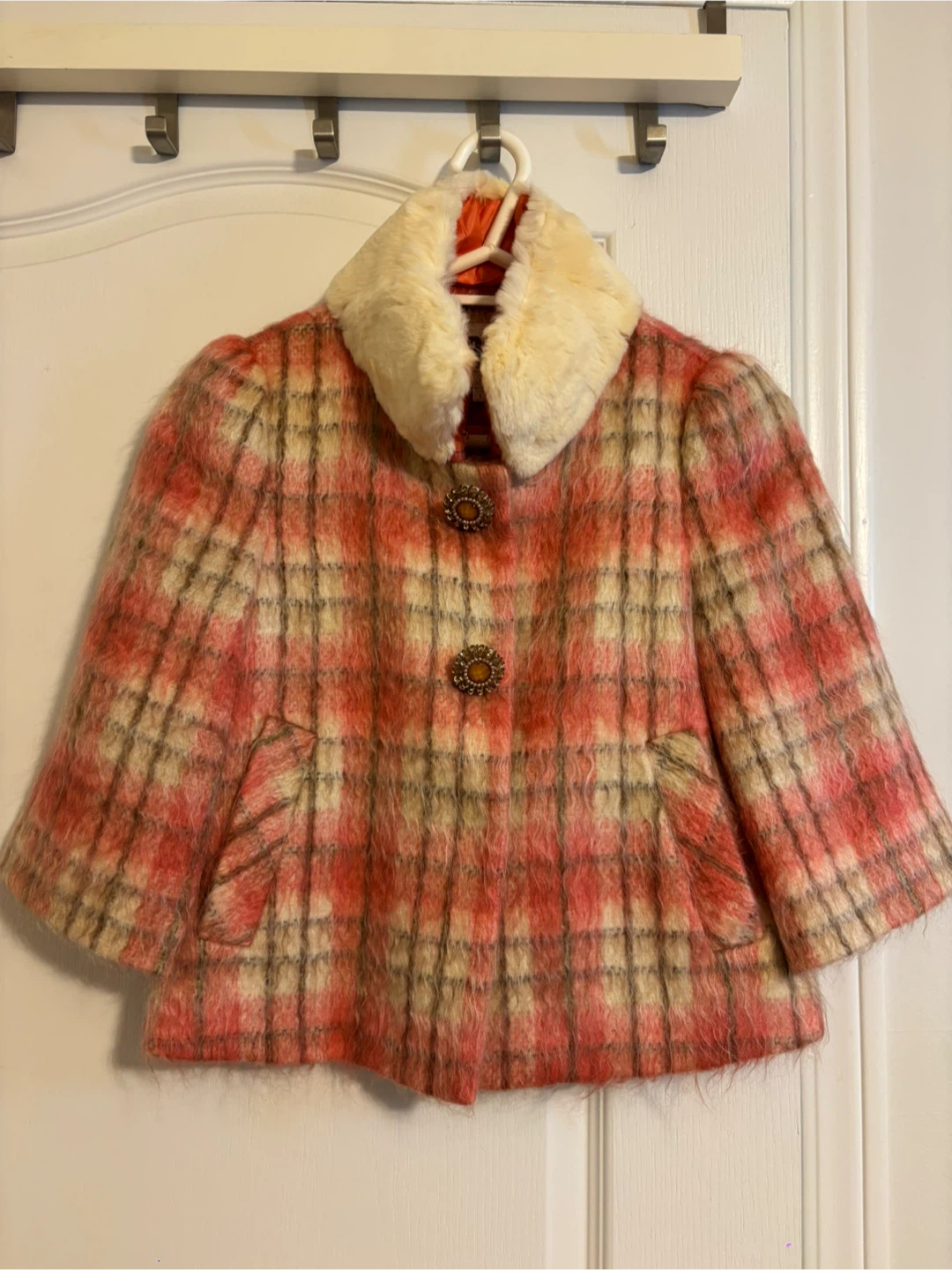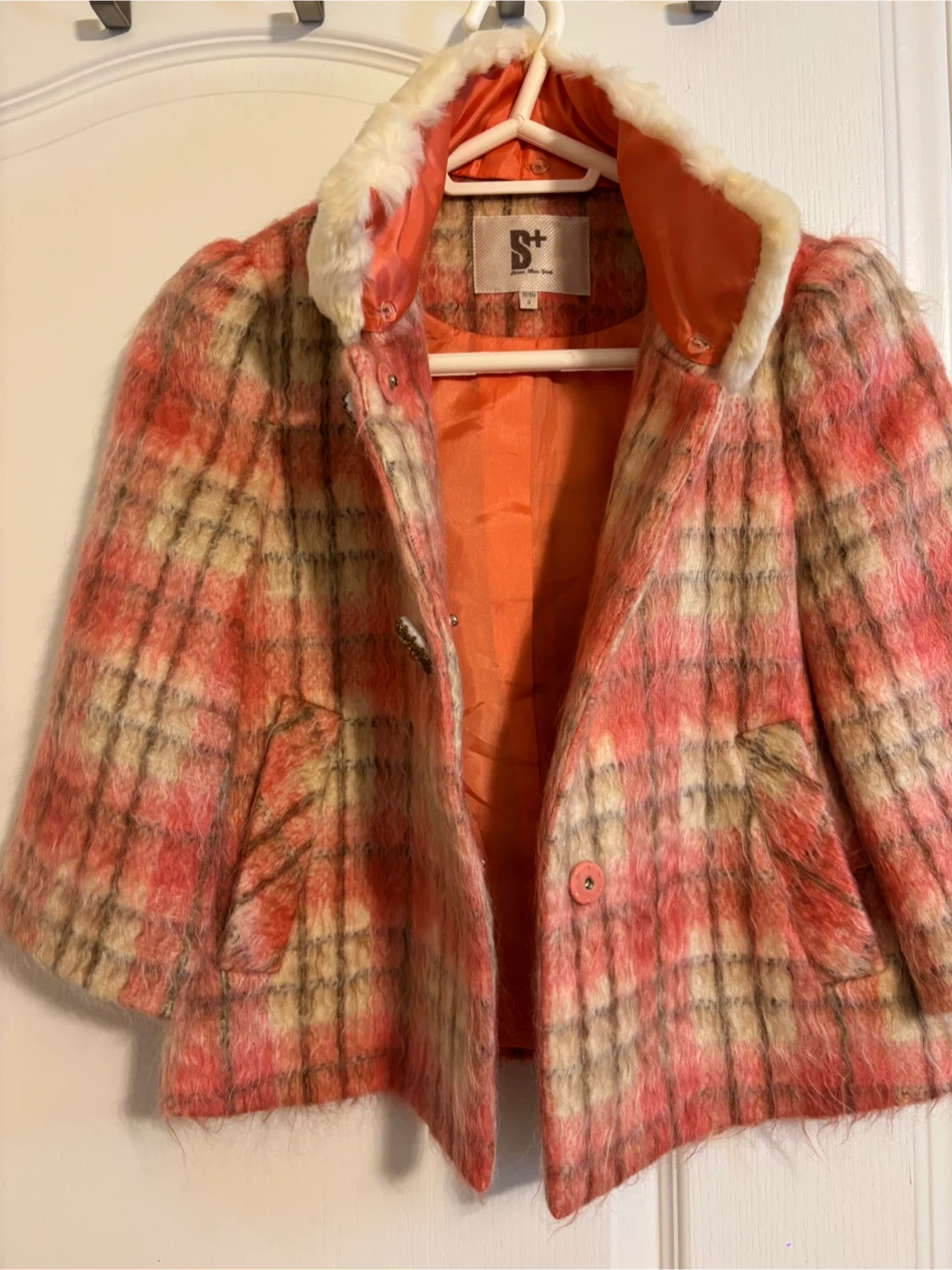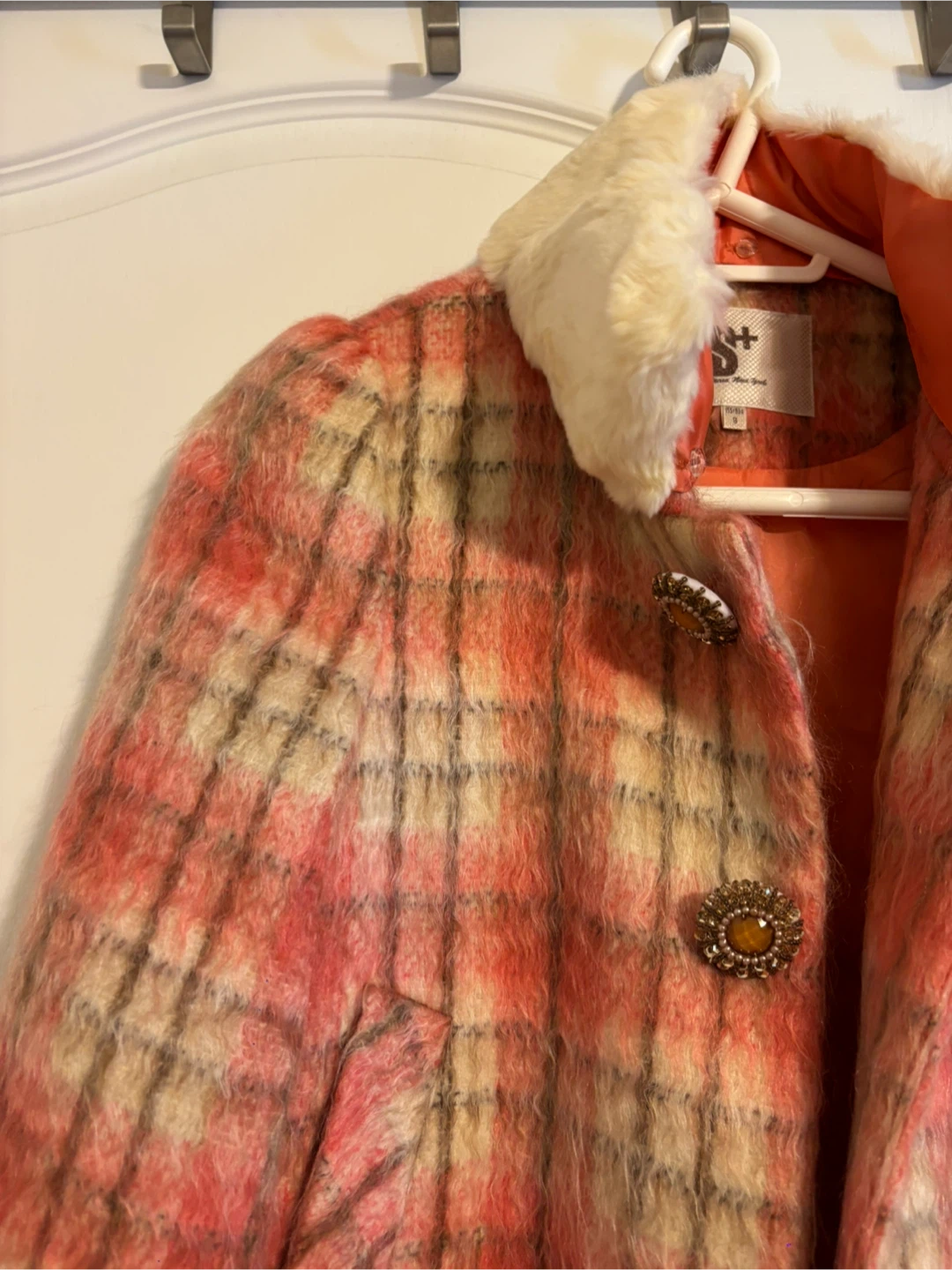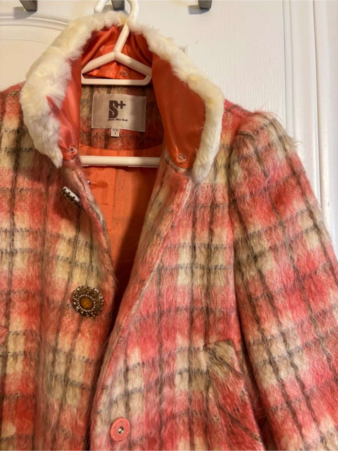 This is a S+ plaid coat in size S. It features a unique design with a faux fur collar and decorative buttons. It's in great condition and ready for a new home!