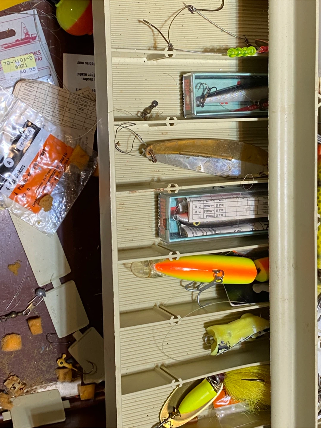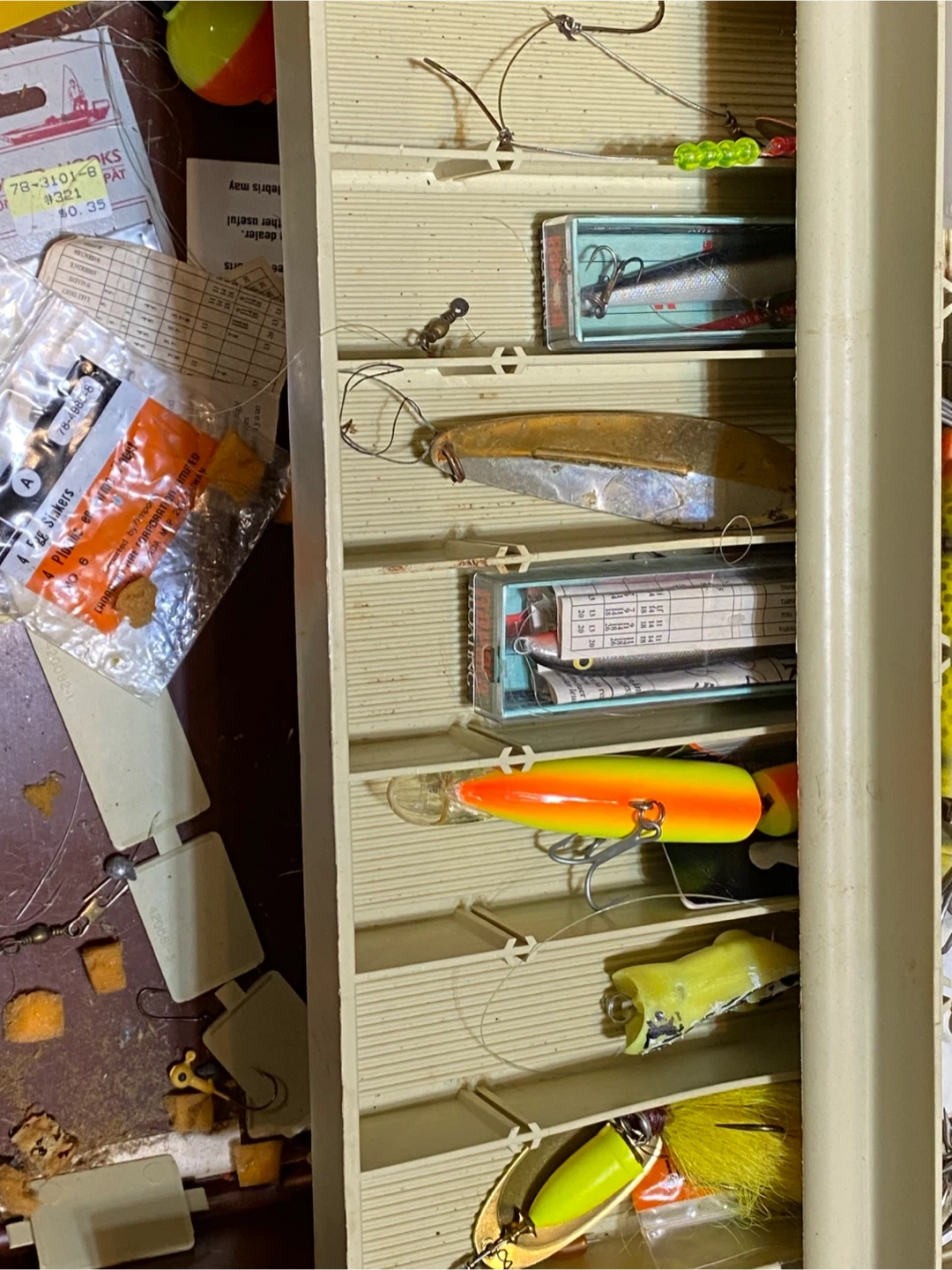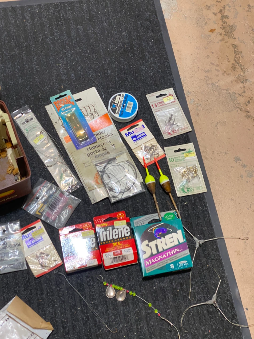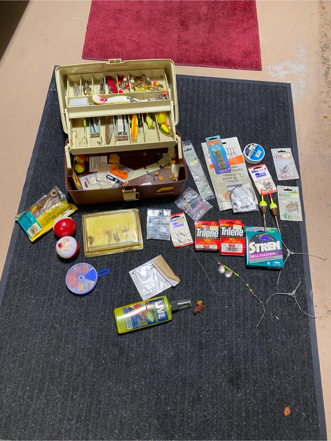 Selling a fishing tackle box filled with various lures, hooks, and accessories! It includes items from brands like Trilene and Stren. Perfect for anyone looking to get into fishing or expand their current gear