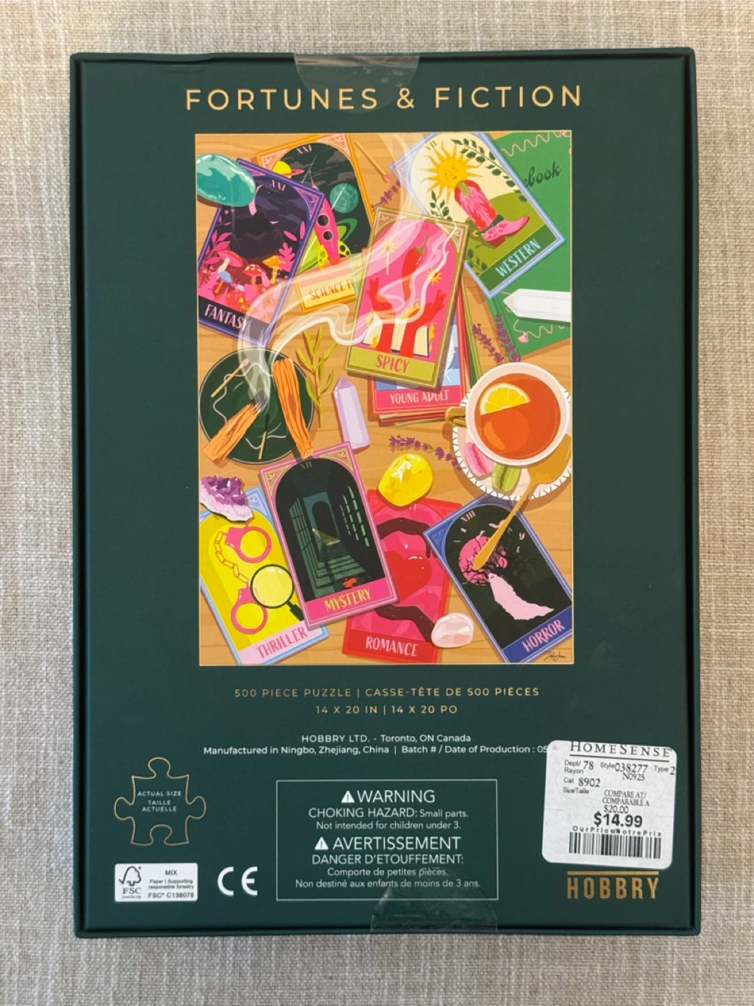 Selling a Hobbyry 'Fortunes & Fiction' 500-piece puzzle! The box and the puzzle are in great condition. The assembled puzzle measures 14 x 20 inches. I bought this for $14.99 at Homesense. It's a fun and engaging activity for puzzle enthusiasts!