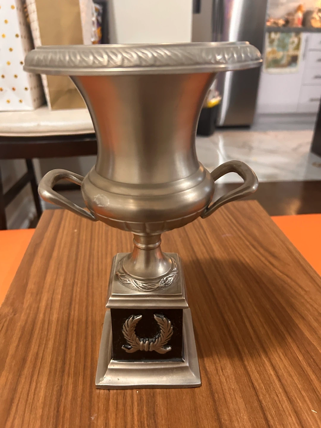 Selling a vintage metal vase. It has a unique design with a decorative rim and base. There are some signs of wear and use, but overall it's in good condition and would make a nice addition to any home.