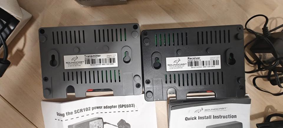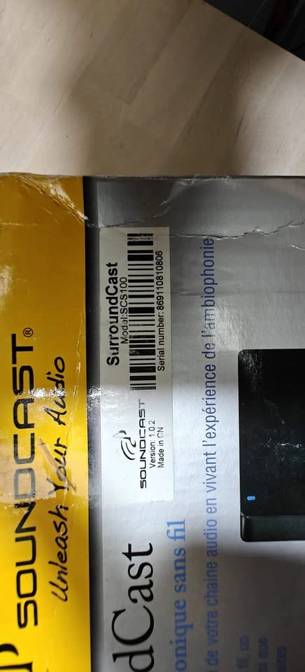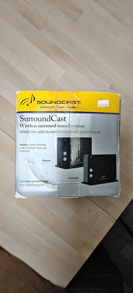 Selling a Soundcast SurroundCast Kit (Model SCS100) in used but good condition. This wireless surround sound kit lets you install rear surround speakers without the hassle of running wires across the room — perfect for a clean, clutter-free home theater setup. (missing one reciver stand)