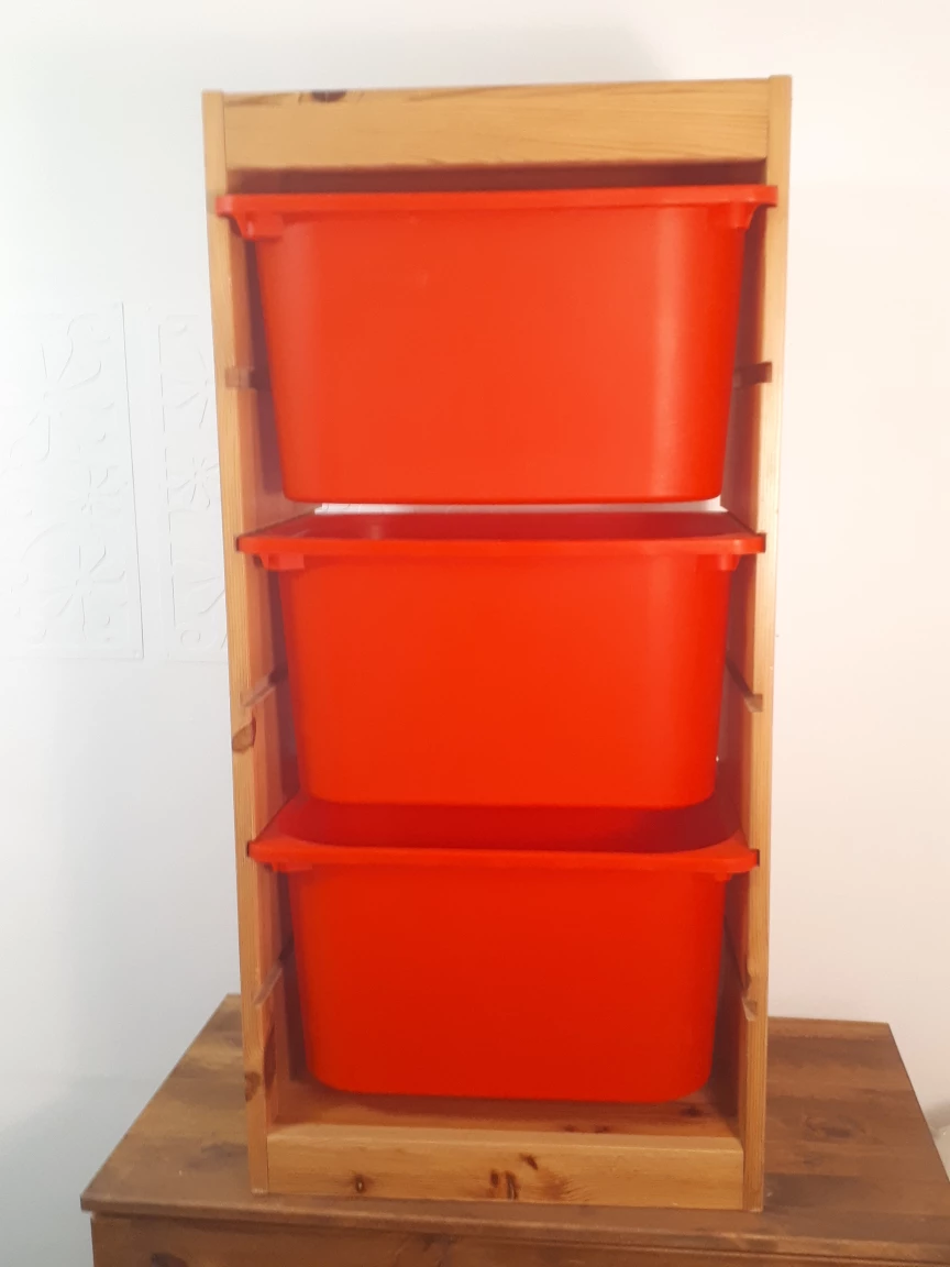 Selling a TROFAST wooden shelf that comes with red bins. It's great for organizing toys, crafts, or anything else you need to keep tidy. Perfect for a playroom or kids' room! Wood surface was thoroughly sanded and varnished with water based laquer for silky smooth surface and easy maintenance.