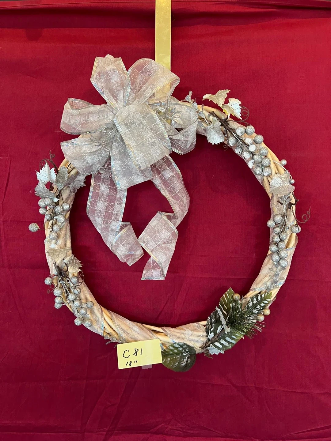 Selling a lovely decorative wreath, perfect for adding a touch of elegance to your home! It features a beautiful silver ribbon and is approximately 18 inches in diameter.