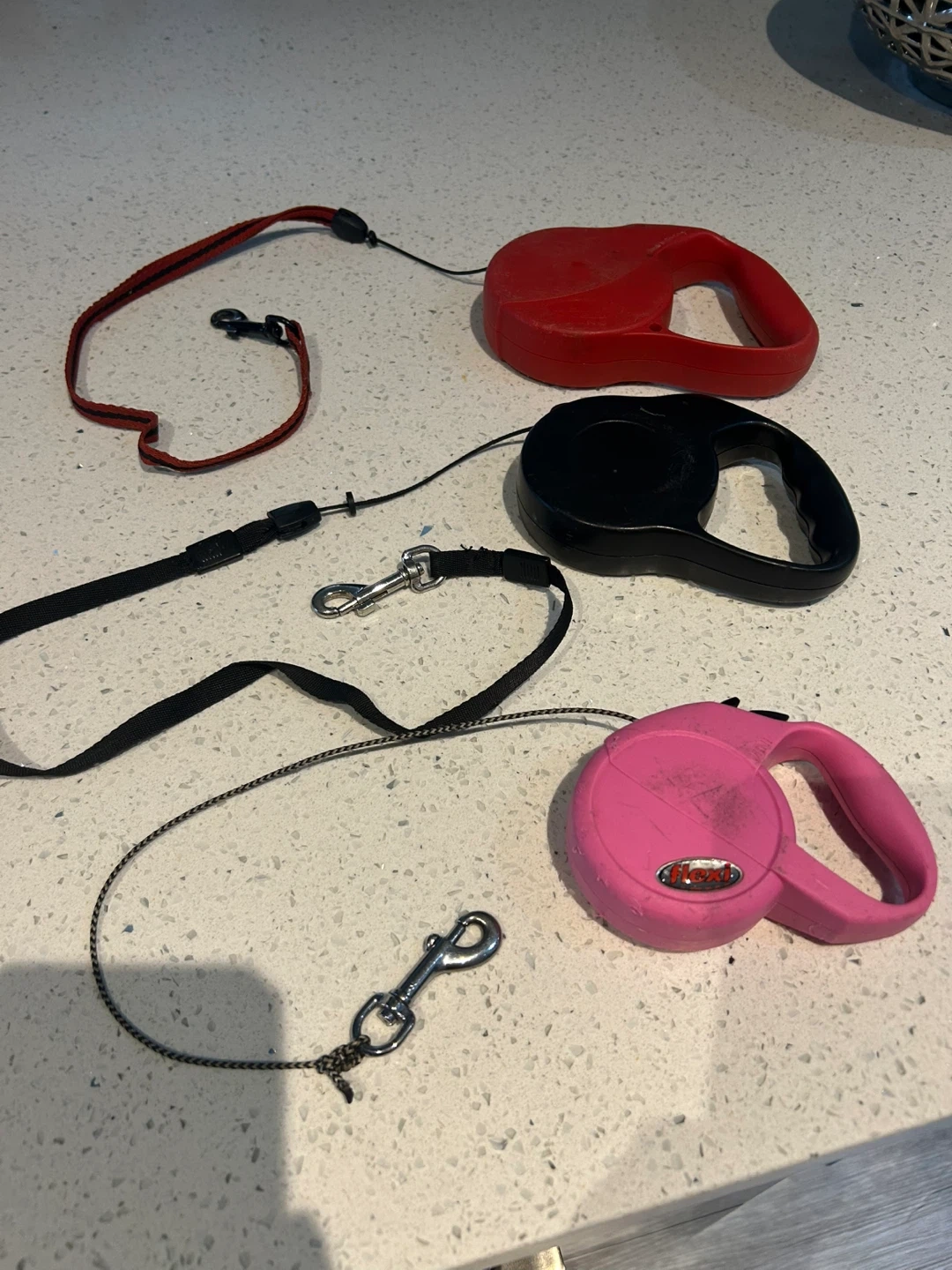 Selling a set of three Flexi retractable dog leashes. There's a red one, a black one, and a pink one. They're all used but still have lots of life left in them for your furry friends!