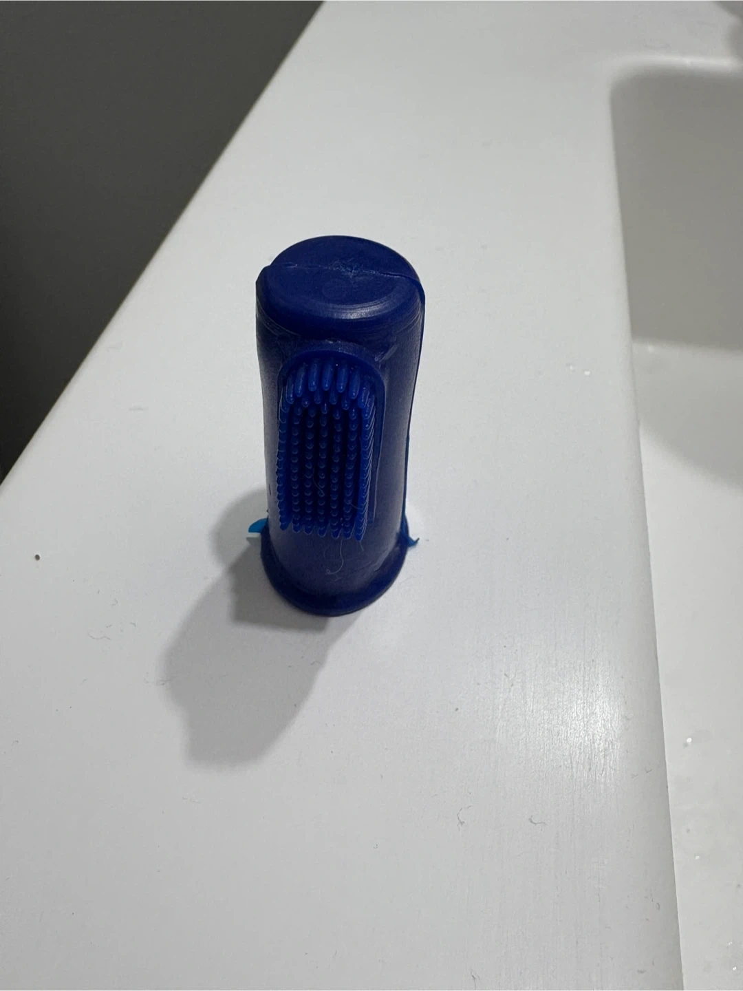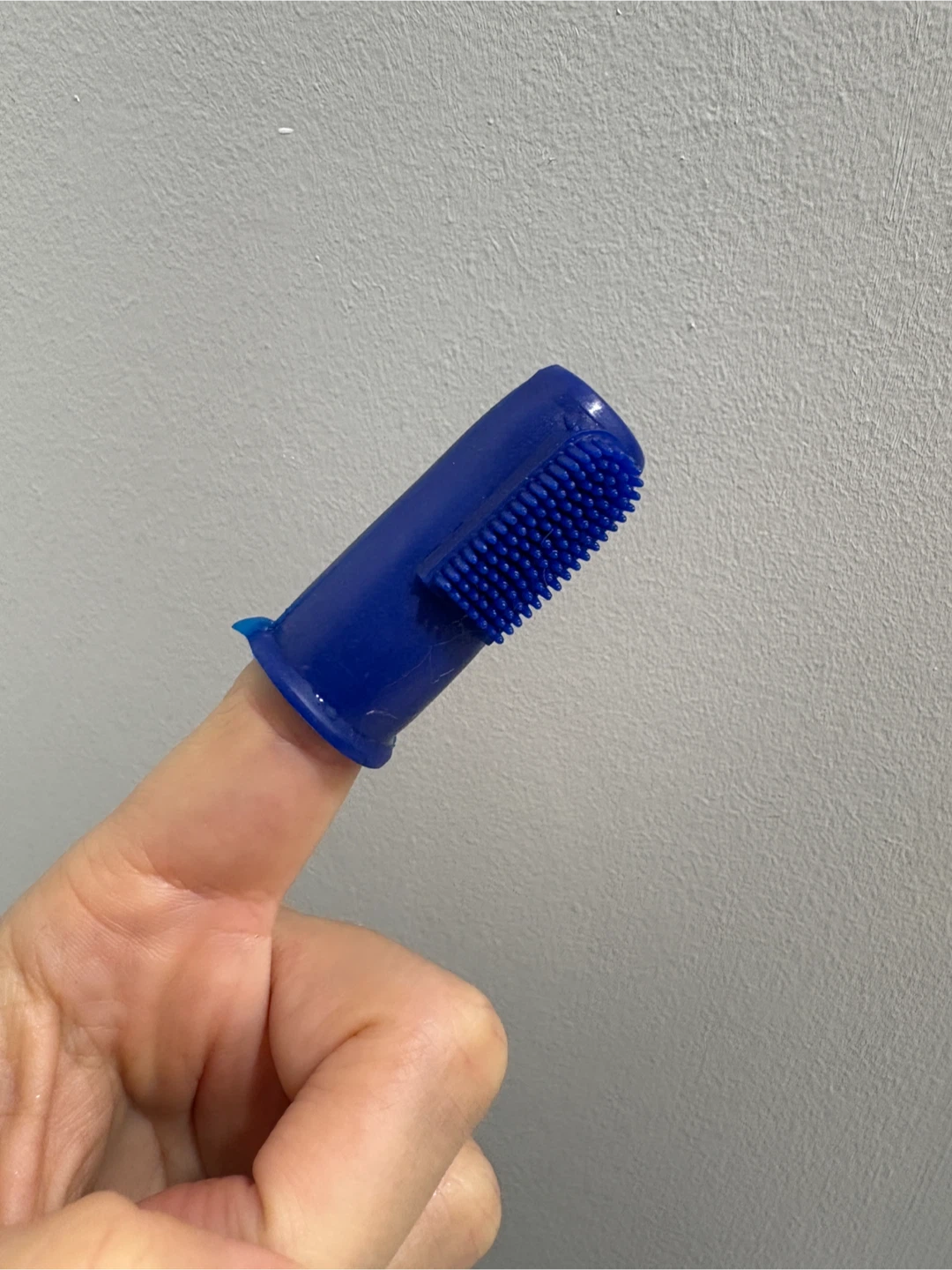 Selling a blue finger toothbrush for pets. It's a convenient way to keep your furry friend's teeth clean and healthy! It slips right onto your finger, making it easy to brush your pet's teeth gently and effectively