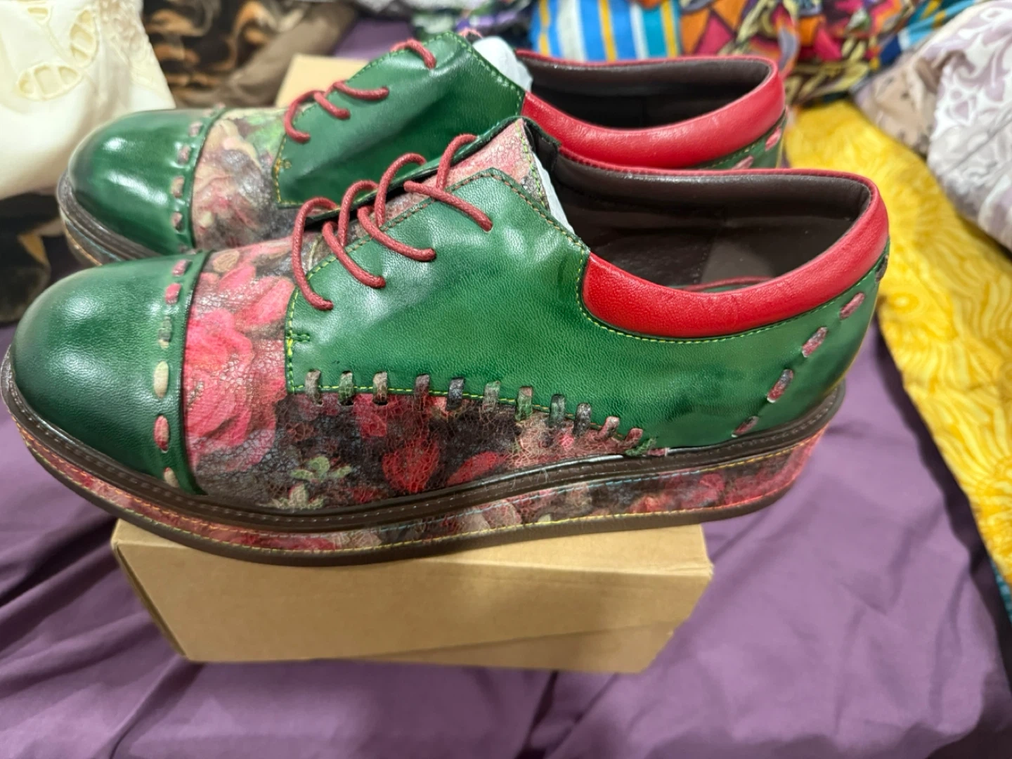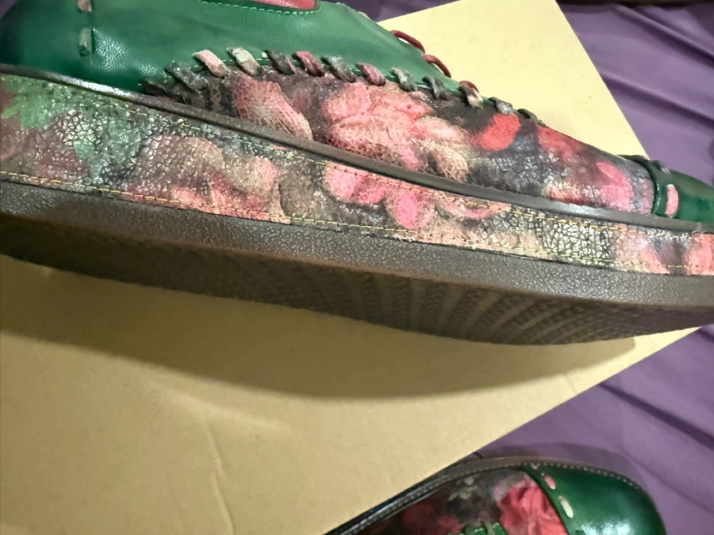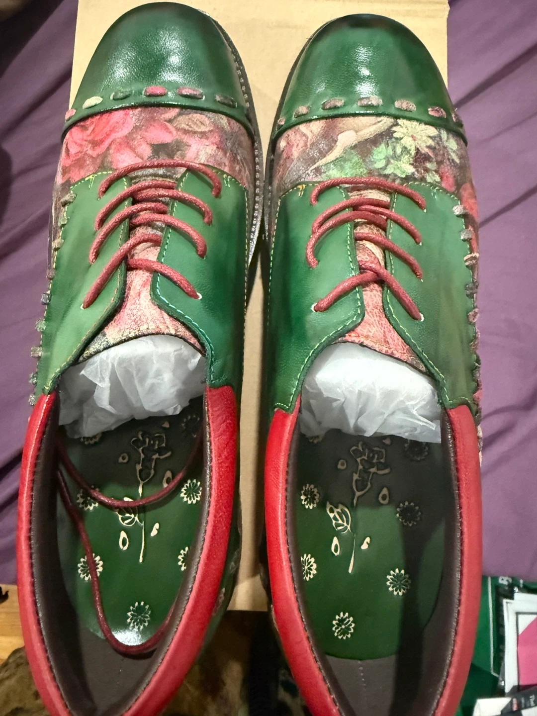 These are some really unique leather shoes with a fun floral pattern! They're mostly green with red accents and red laces. The shoes are in great condition and come with their original box