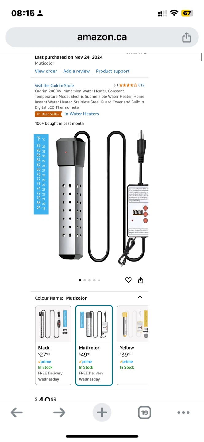 Selling a Cadrim 2000W immersion water heater. In the box . Like new . Used only once. It's a constant temperature model, electric submersible, and great for home use. It heats water instantly and has a stainless steel guard cover with a built-in digital LCD thermometer. Colour is multicolor. Originally $49.99.