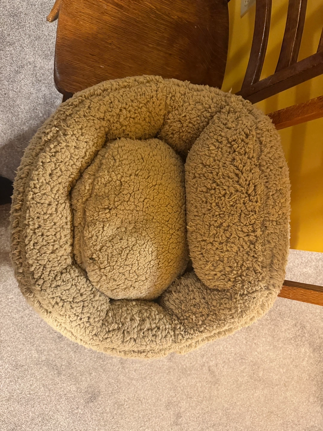 Selling a comfy beige pet bed! It's in great shape and ready for a new furry friend to enjoy. It's super soft and perfect for your cat or small dog to curl up in for a nap. A great addition to any room!