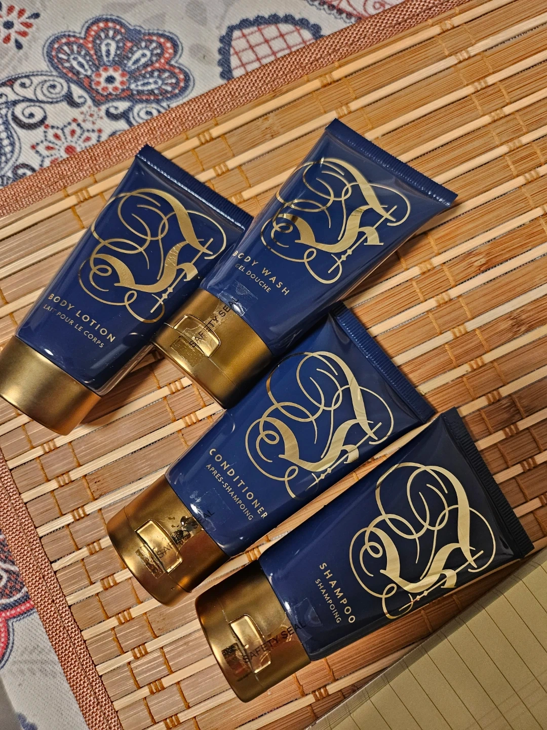 Set of hotel amenities! Includes body lotion, body wash, conditioner, and shampoo.