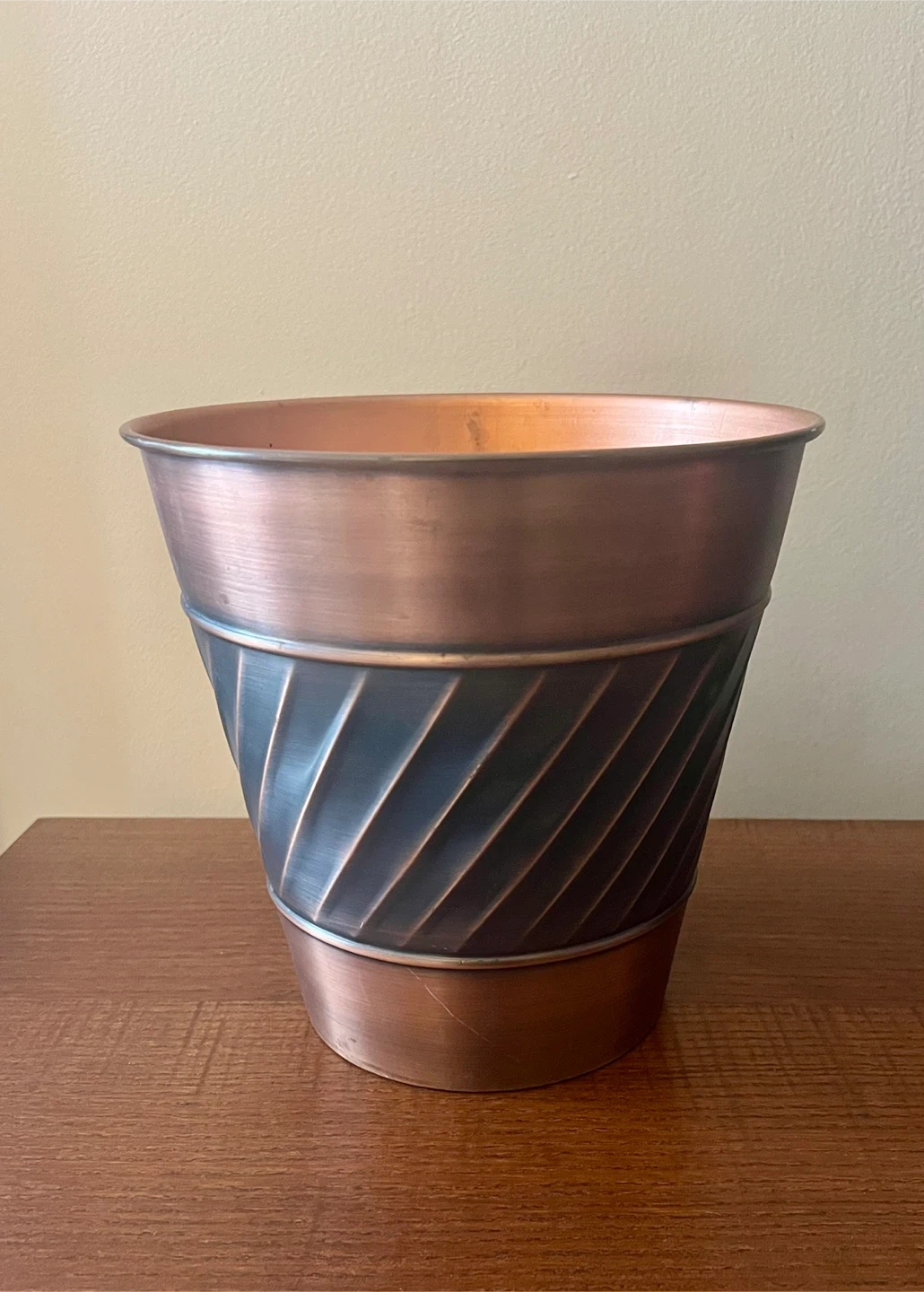 Technically a trash can, but I used it as a decorative cache pot for my plant.