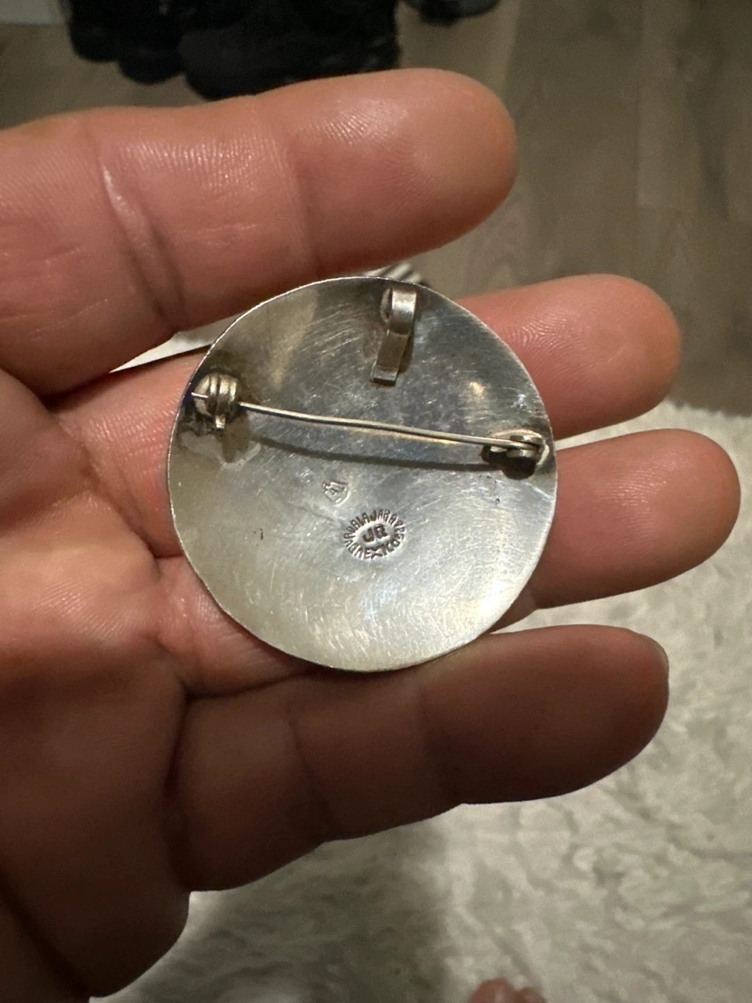 Selling a vintage sterling silver brooch pin. It features a detailed design with a figure, donkey, and mountain scene. The back has a pin closure and is marked 'Sterling' and 'Mexico'. It's a unique piece!
