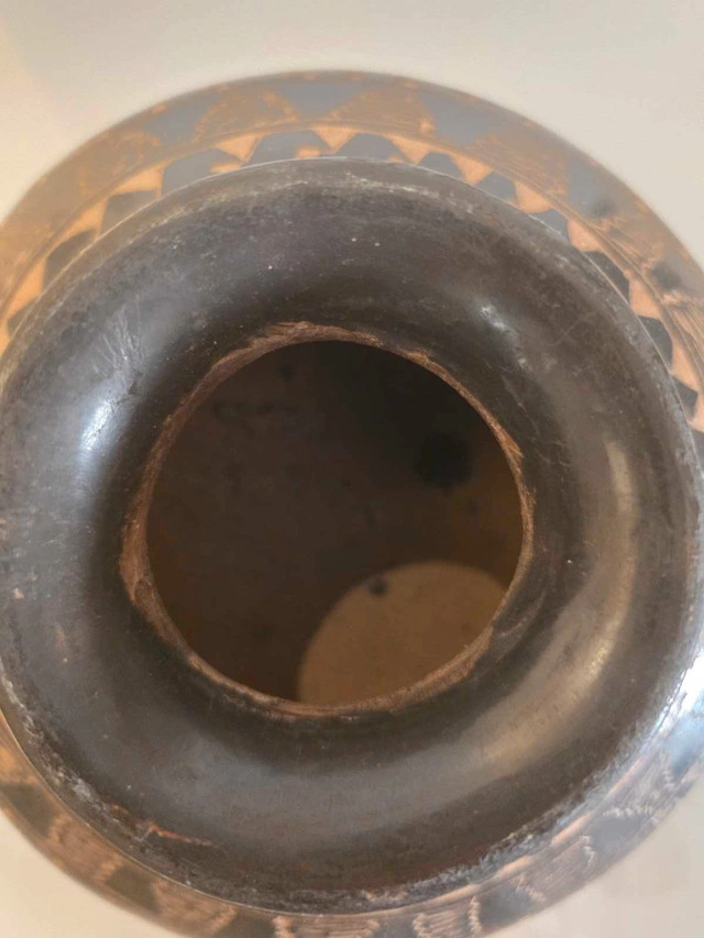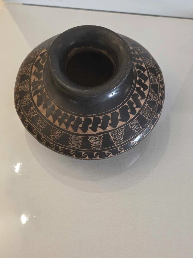 This is a piece of Costa Rican pottery, likely from the Chorotega people. The pottery is made from local clay mixed with fine freshwater sand and is shaped on a hand-operated pottery wheel. The artisans hand-polish the piece to give it a smooth texture and luster. The style is known as "sgraffito," which involves scratching or carving a design into the surface of the pottery. This type of pottery is often made in Guaitil, a village in Costa Rica known for its potters who use techniques passed down from their Chorotega ancestors. This little piece of art is just waiting to find its new home.