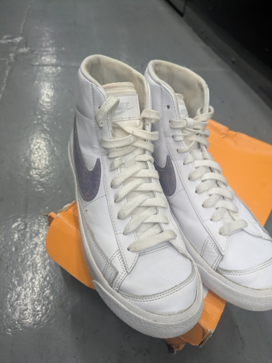 Selling a pair of Nike Blazer High Top White Canyon Purple Gray Fog Sneakers 9.5 They show some signs of wear, but still have a lot of life left in them! Comes with the original box.