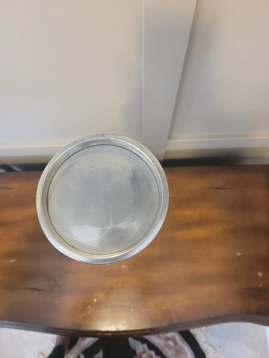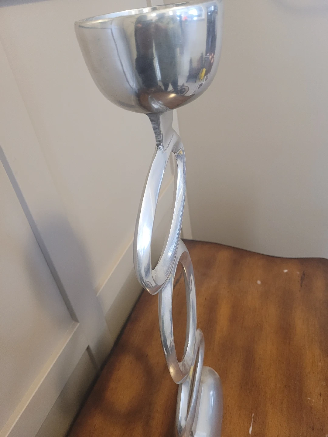 15Selling a unique silver metal decorative stand! It's in great condition and would look lovely in any home. The stand features a bowl-shaped top with an interesting design of interconnected circles down the middle.