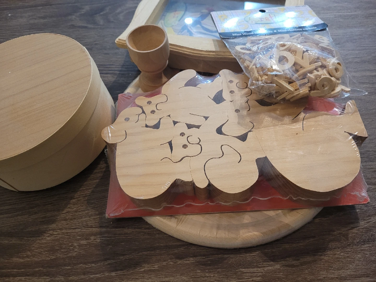 15Here's a fun unfinished wood crafting kit! It includes a frame, wooden numbers, a round box, and some wooden shapes. Perfect for a variety of DIY projects!